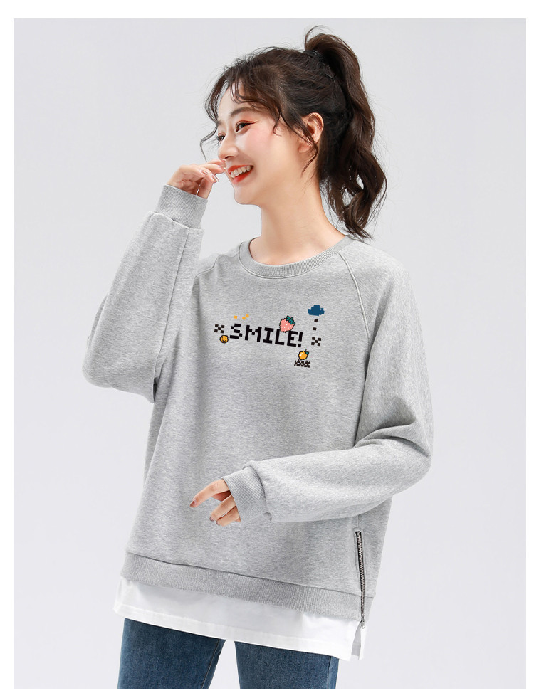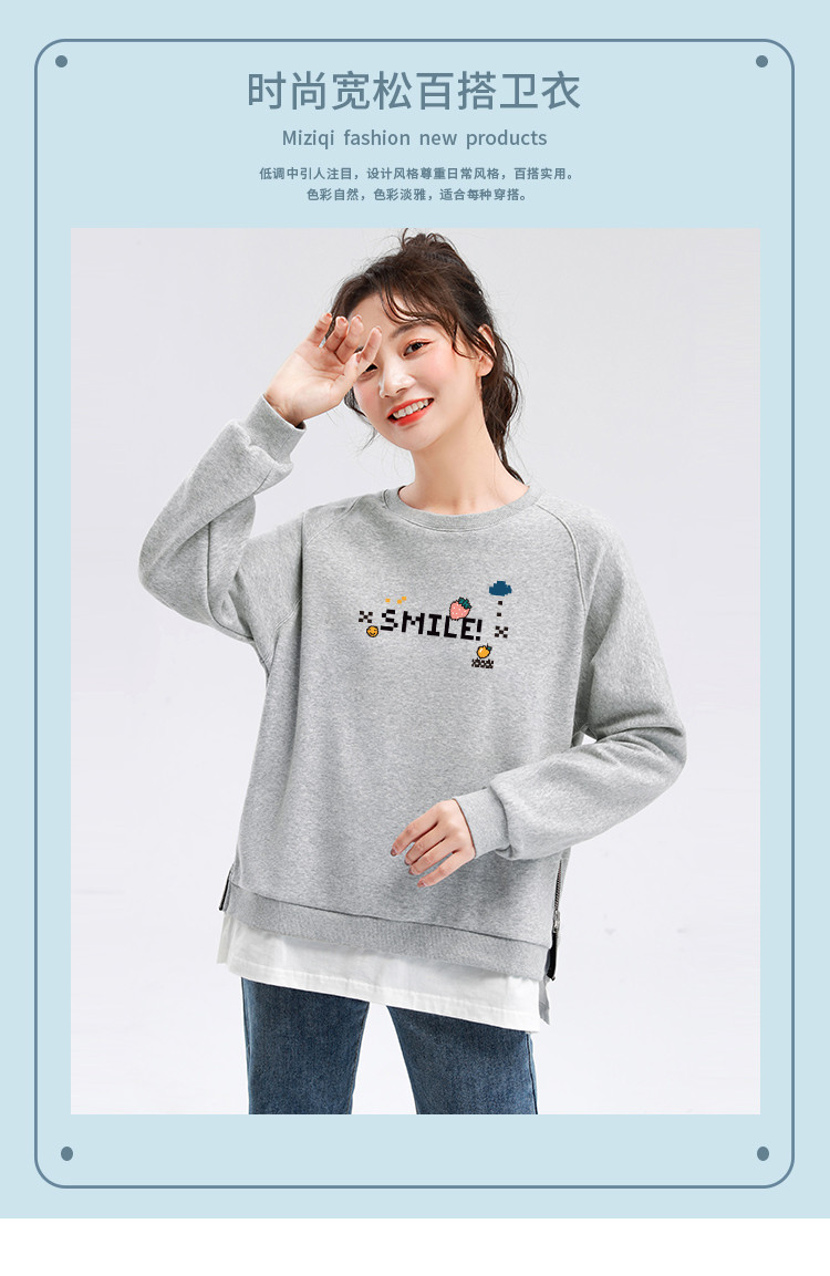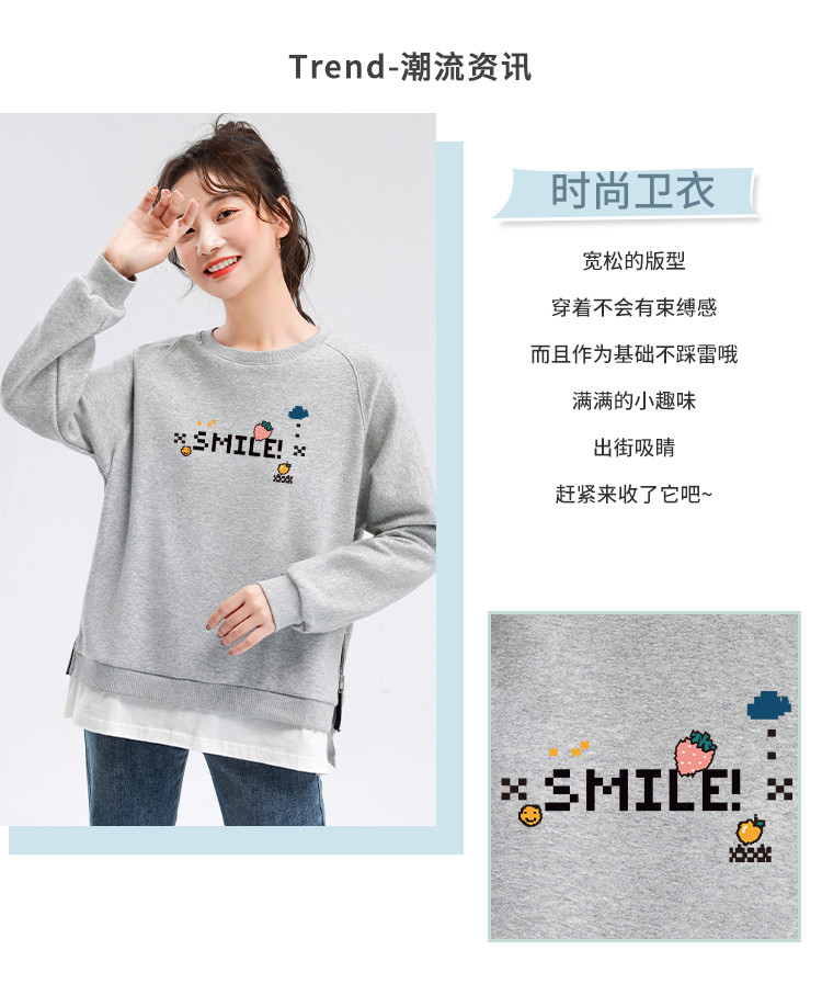 商品名称:米子旗女式卫衣春秋款字母印花日系风格假两件侧边开叉外套上衣女 018330