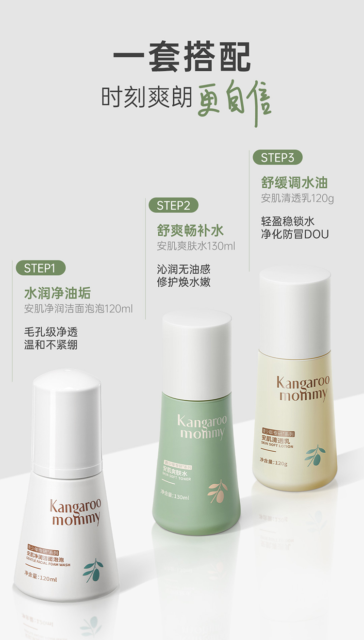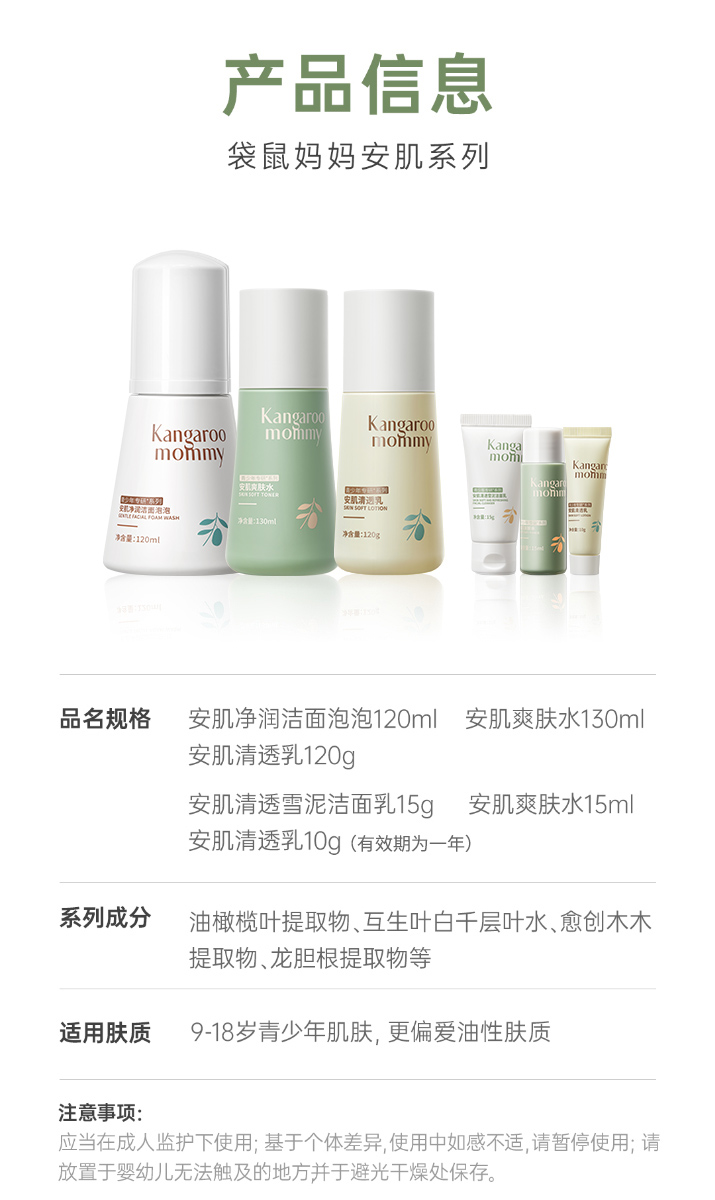 商品名称:【青少年护肤品套装】袋鼠妈妈儿童洗面奶男女孩学生党青春期水乳儿童水乳洁面套装