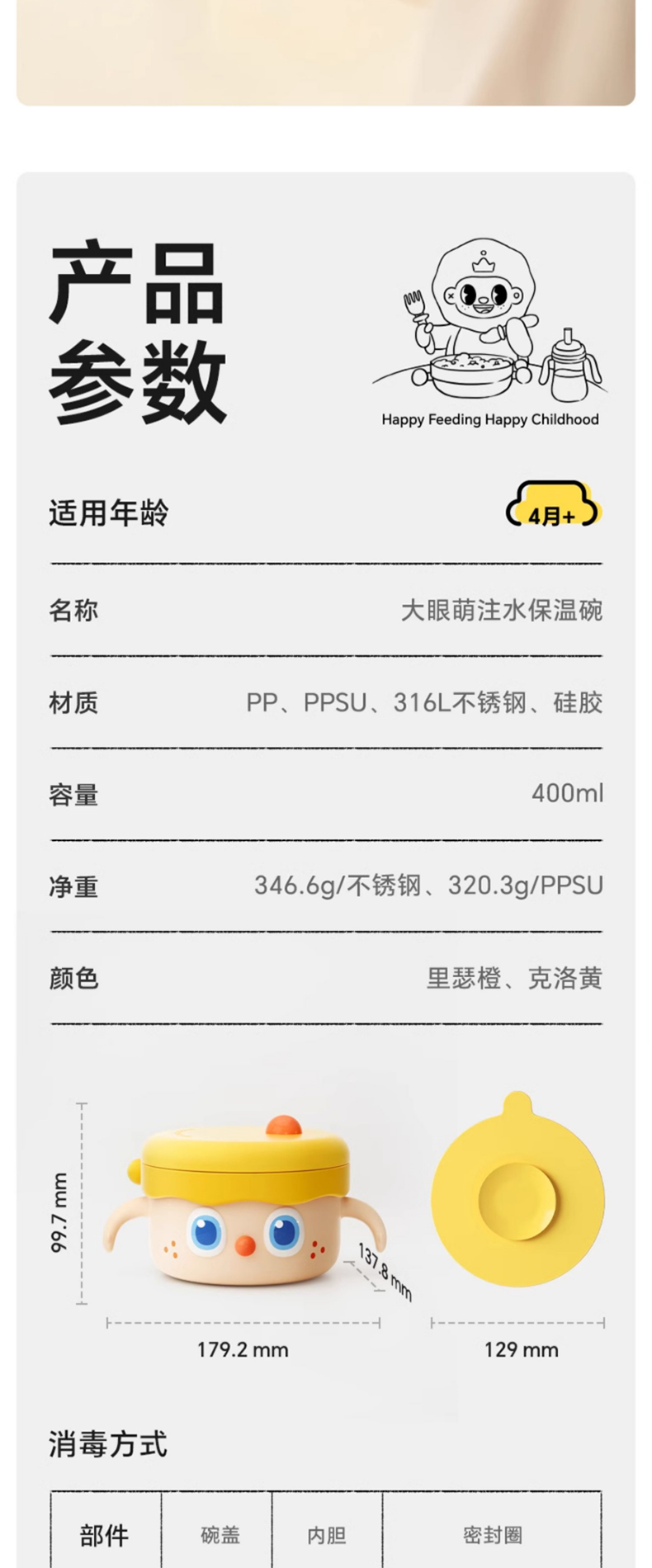 商品名称:VS皇宠大眼萌注水保温碗不锈钢辅食刻度餐盘学习叉勺好吸汤碗训练筷子米糊碗宝宝餐具