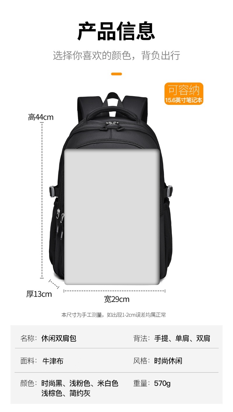 商品名称:彤彤兔 纯色双肩包15.6寸牛津布防泼水初高中大学生背包休闲旅行包