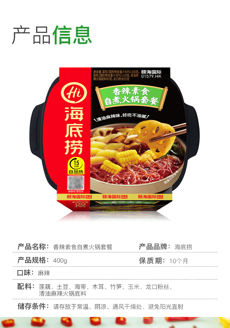 商品名称:海底捞 香辣素食自煮火锅套餐400g清油麻辣懒人即食方便小火锅