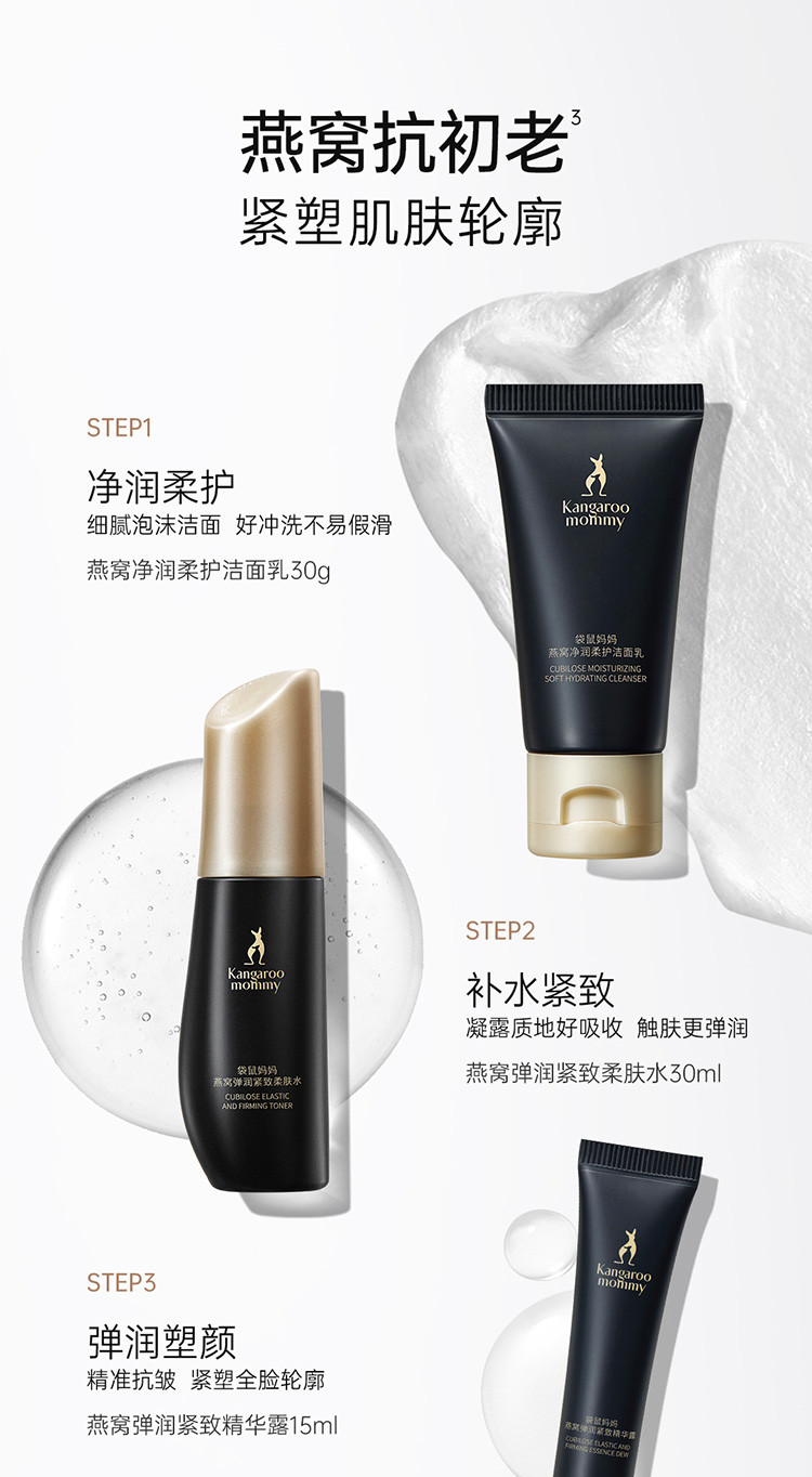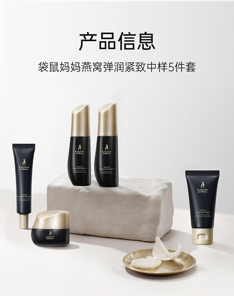 商品名称:【便携5件套】袋鼠妈妈燕窝护肤品中样套装洁面水乳霜精华补水保湿紧致护肤旅行出差