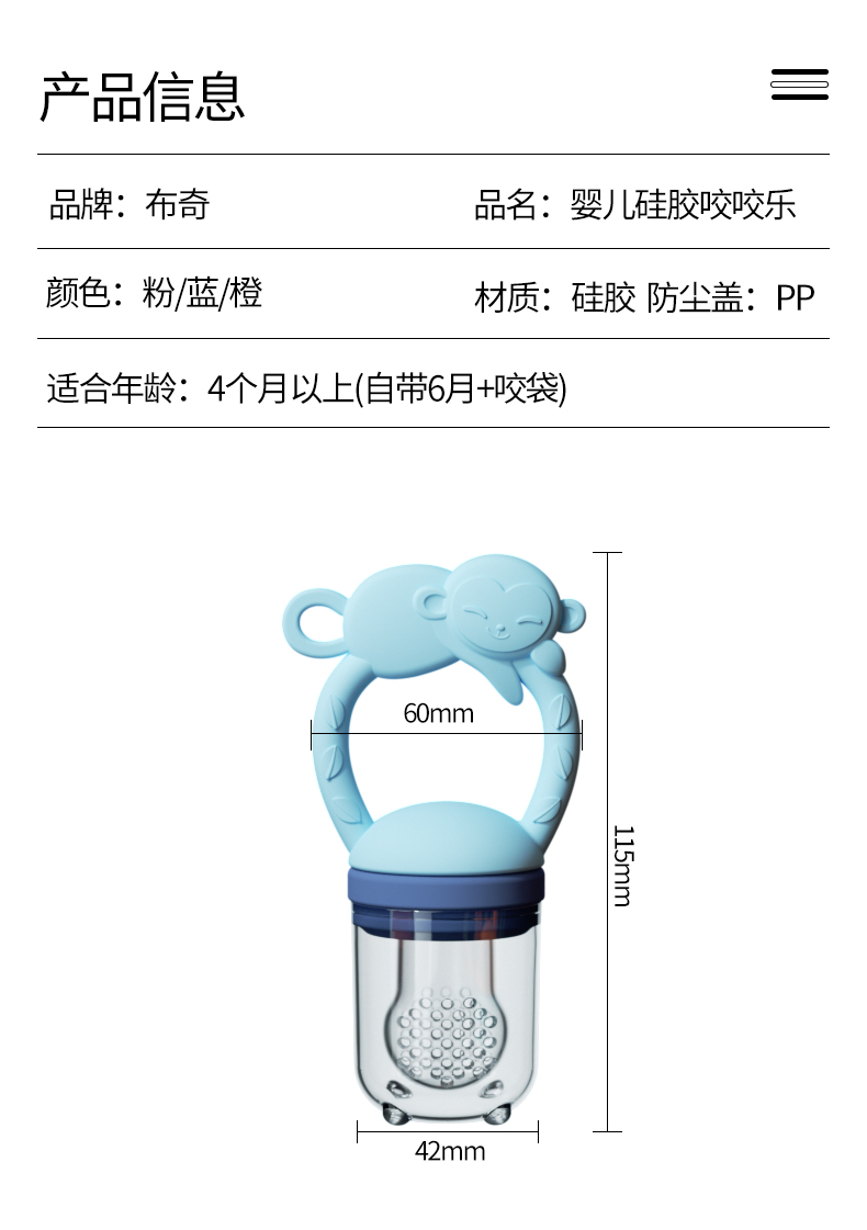 商品名称:布奇BOOKY婴儿果汁咬咬乐硅胶牙胶宝宝吃水果辅食神器果蔬磨牙棒咬咬袋安抚奶嘴