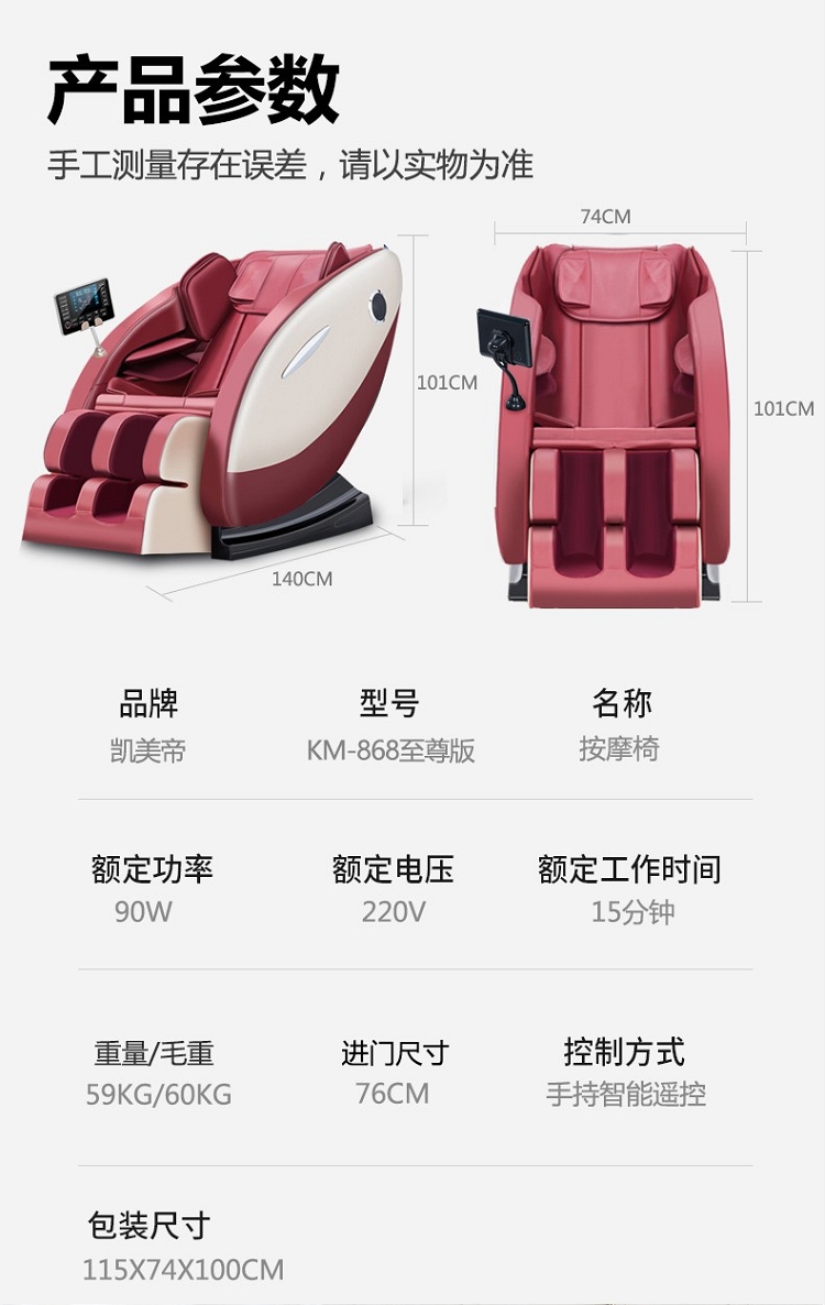 商品名称:凯美帝按摩椅KM-868大屏液晶触控音乐太空豪华舱自动摇摆新款电动揉捏多功能