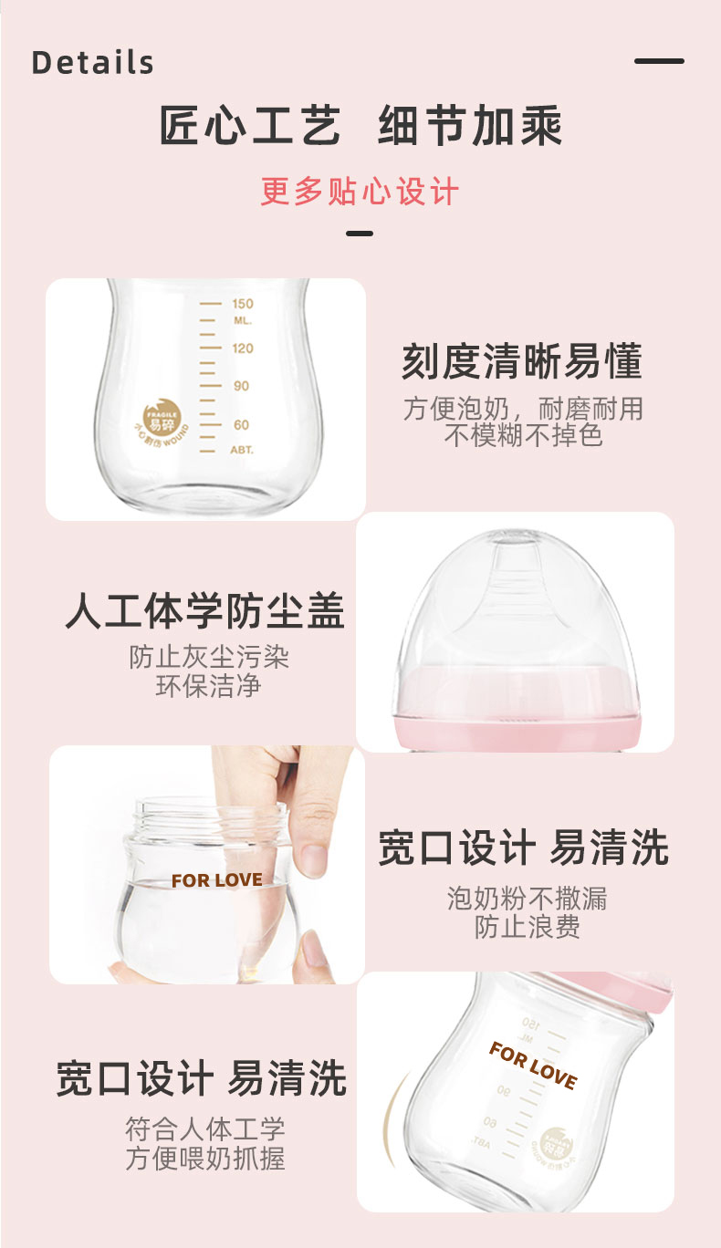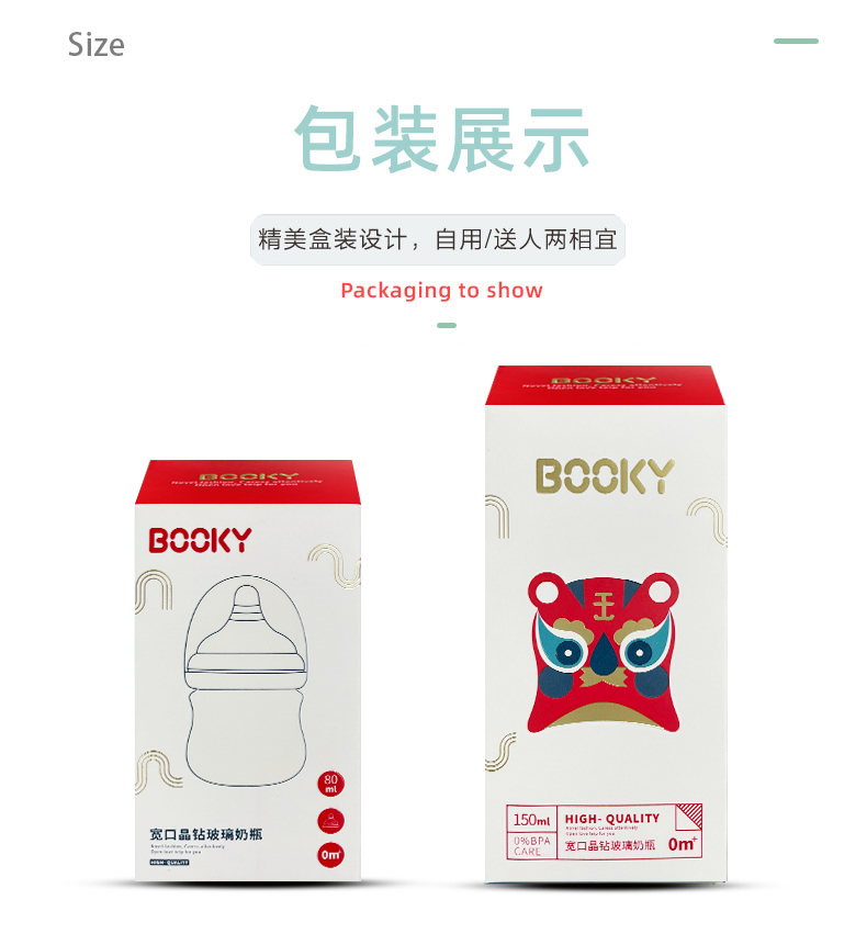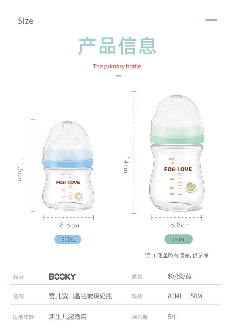 商品名称:【1:1送奶瓶刷】布奇BOOKY新生儿宽口径玻璃奶瓶防呛防胀气喝水喂药小奶瓶80ML/150ML