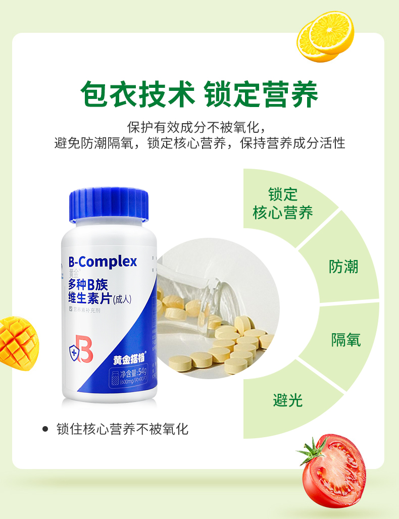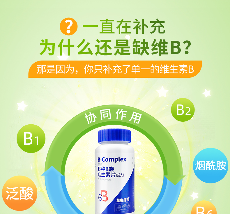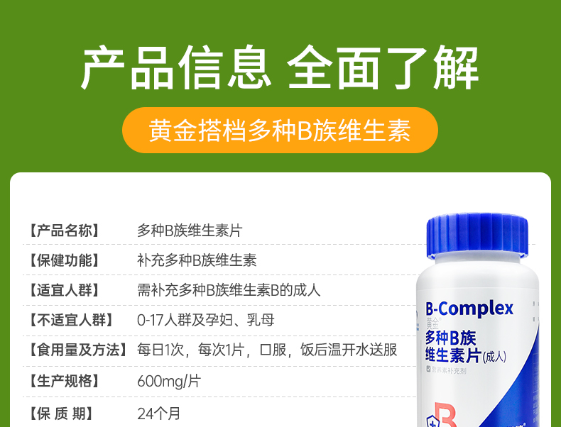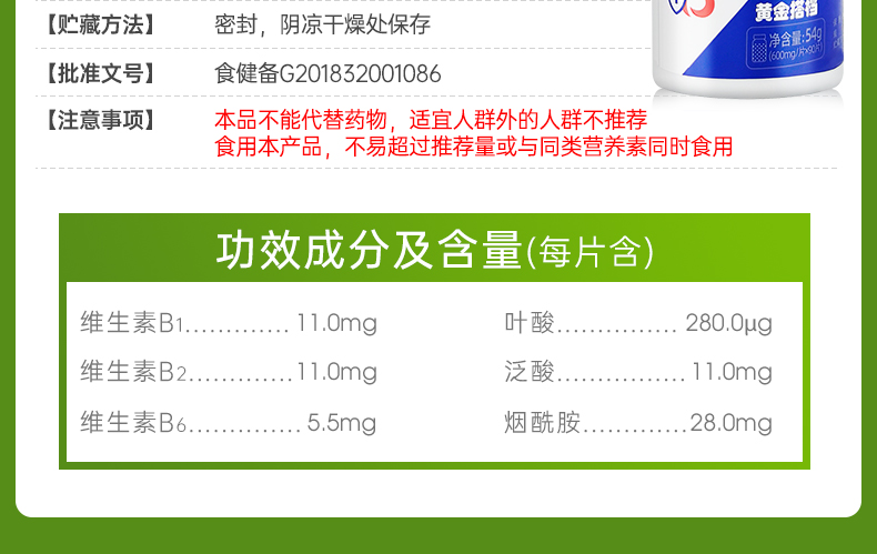 商品名称:黄金搭档 维生素B族片 含vb1 维B2 B6 叶酸和B3 补充男女成人多种复合维生素600mg/片*90片