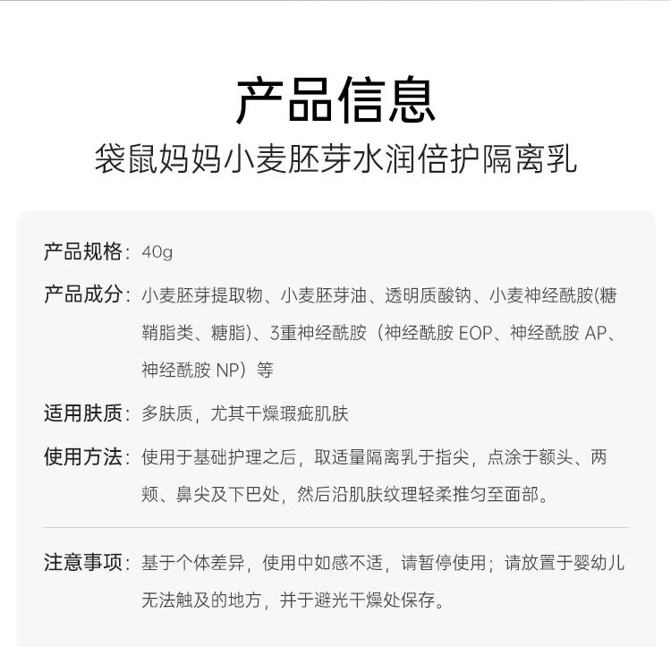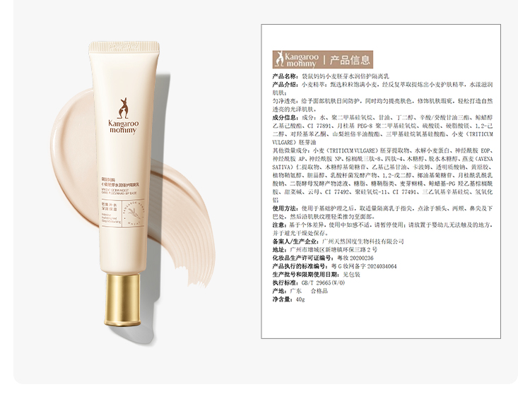 商品名称:【隔离乳妆前乳】袋鼠妈妈准孕妇隔离霜保湿轻薄隔离乳遮瑕护肤品化妆品旗舰店正品40g
