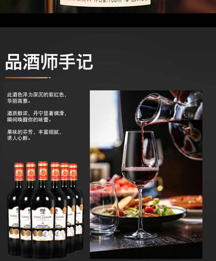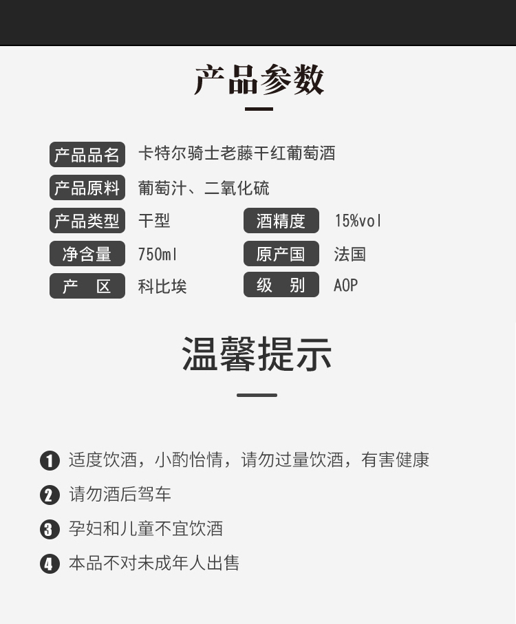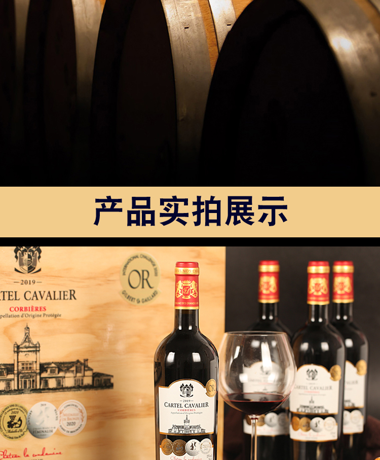 商品名称:卡特尔法国进口红酒获5奖项骑士老藤干红葡萄酒750ml*6支精美木箱包装