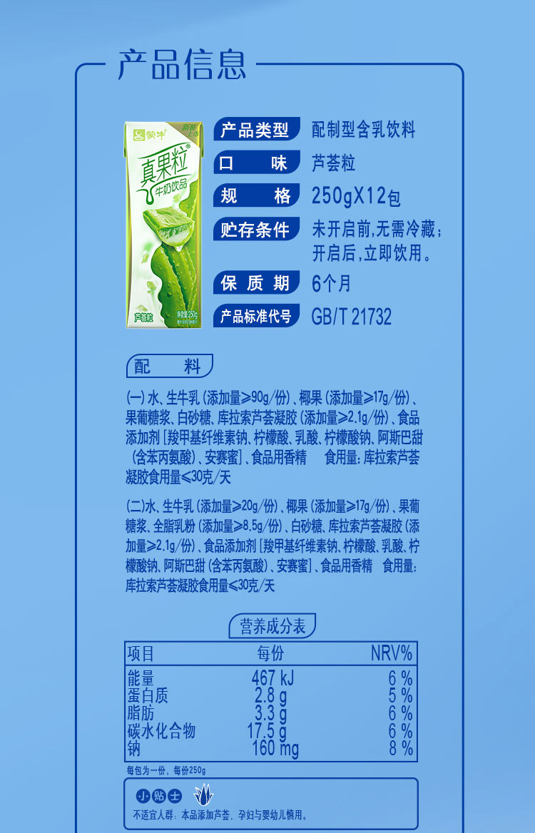 商品名称:蒙牛真果粒芦荟果粒牛奶饮品250ml*12包