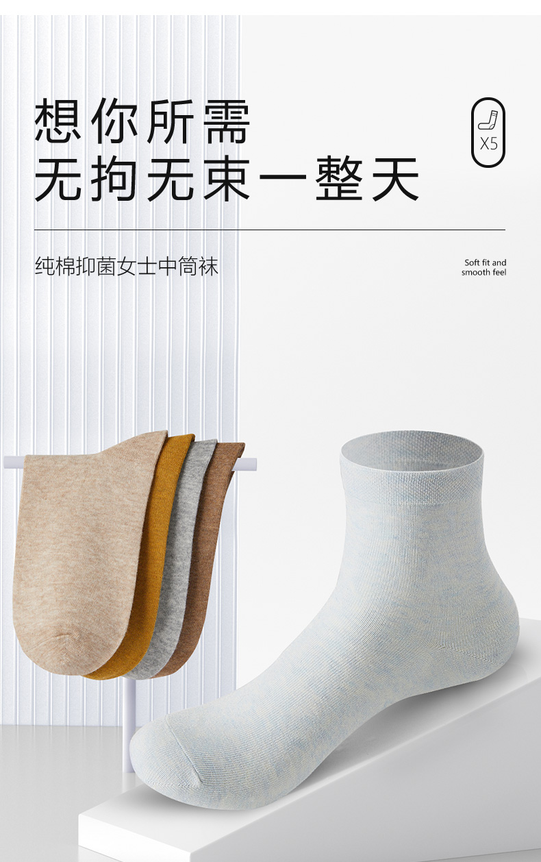 商品名称:花花公子5双装女士袜子夏季中筒袜舒适防臭吸汗全棉袜子纯棉女款女生袜子夏天棉女袜