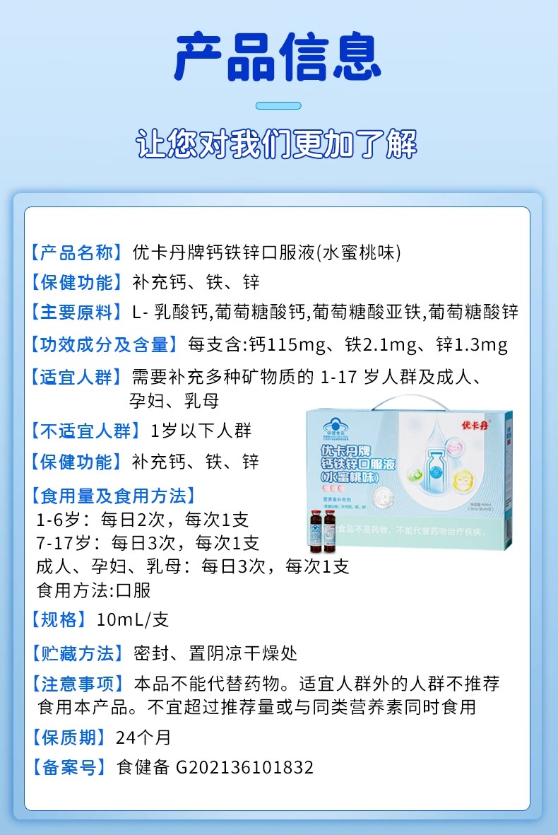 商品名称:优卡丹钙铁锌口服液水蜜桃味90支葡萄糖酸锌婴幼儿儿童青少年补钙补铁补锌营养液