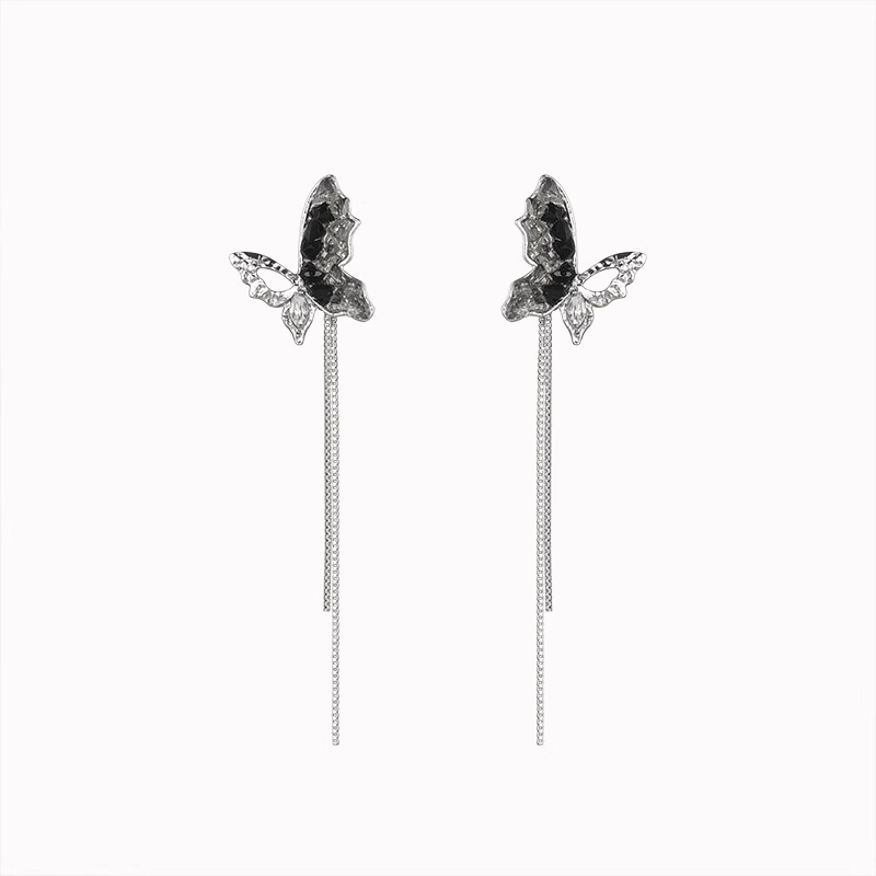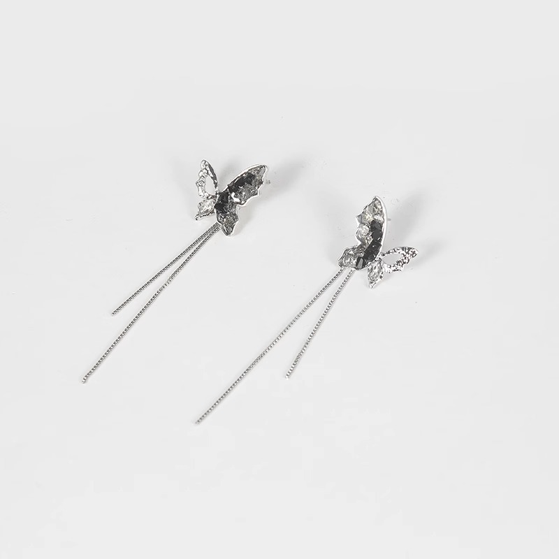 彤彤兔 S925银针黑色水晶蝴蝶流苏耳环女高级感小众设计气质长款耳饰