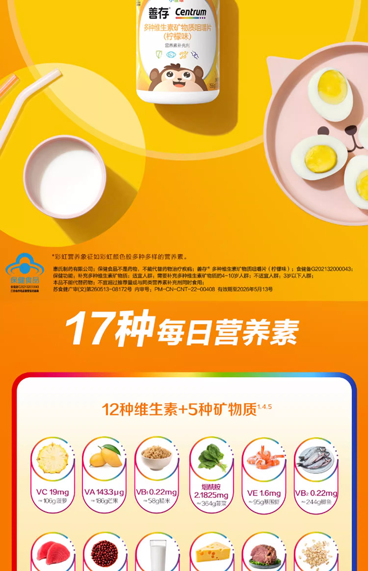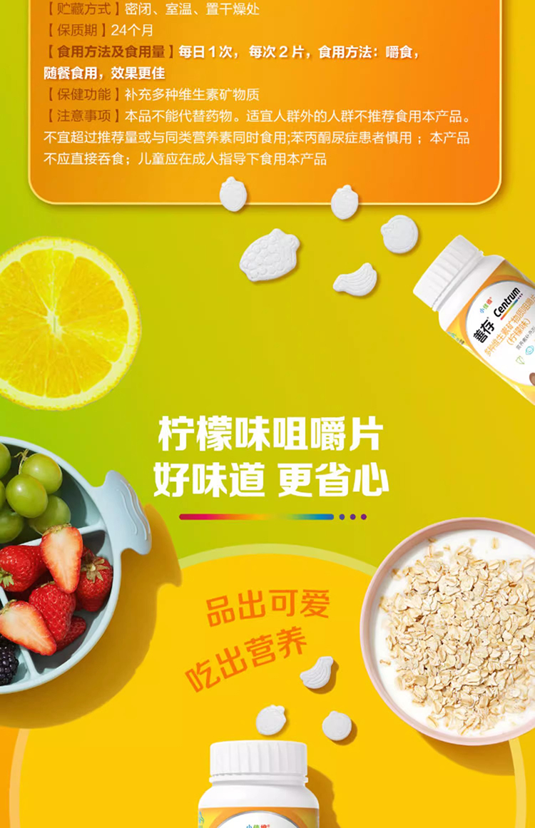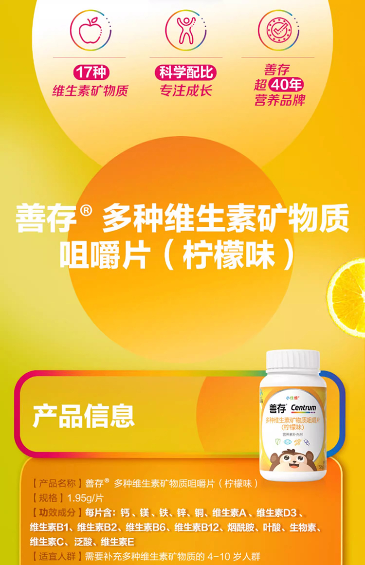 商品名称:善存小佳维多种维生素矿物质咀嚼片40片儿童b族补充vc维C维生素c钙铁锌复合维生素钙片