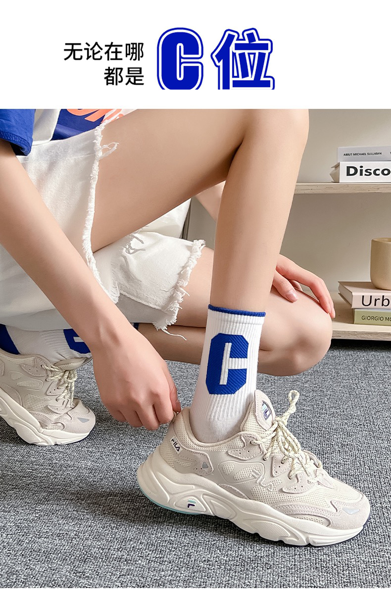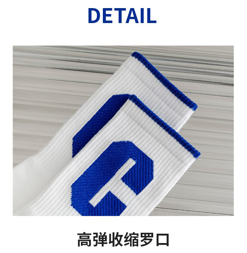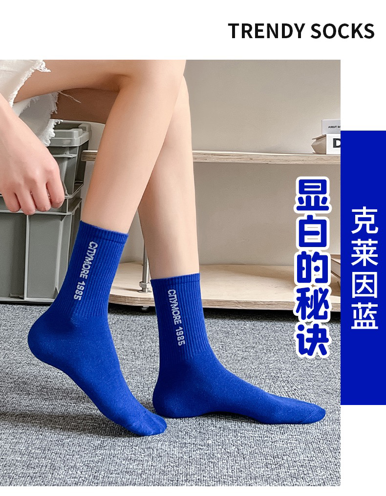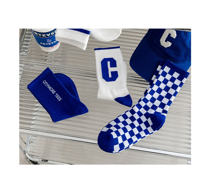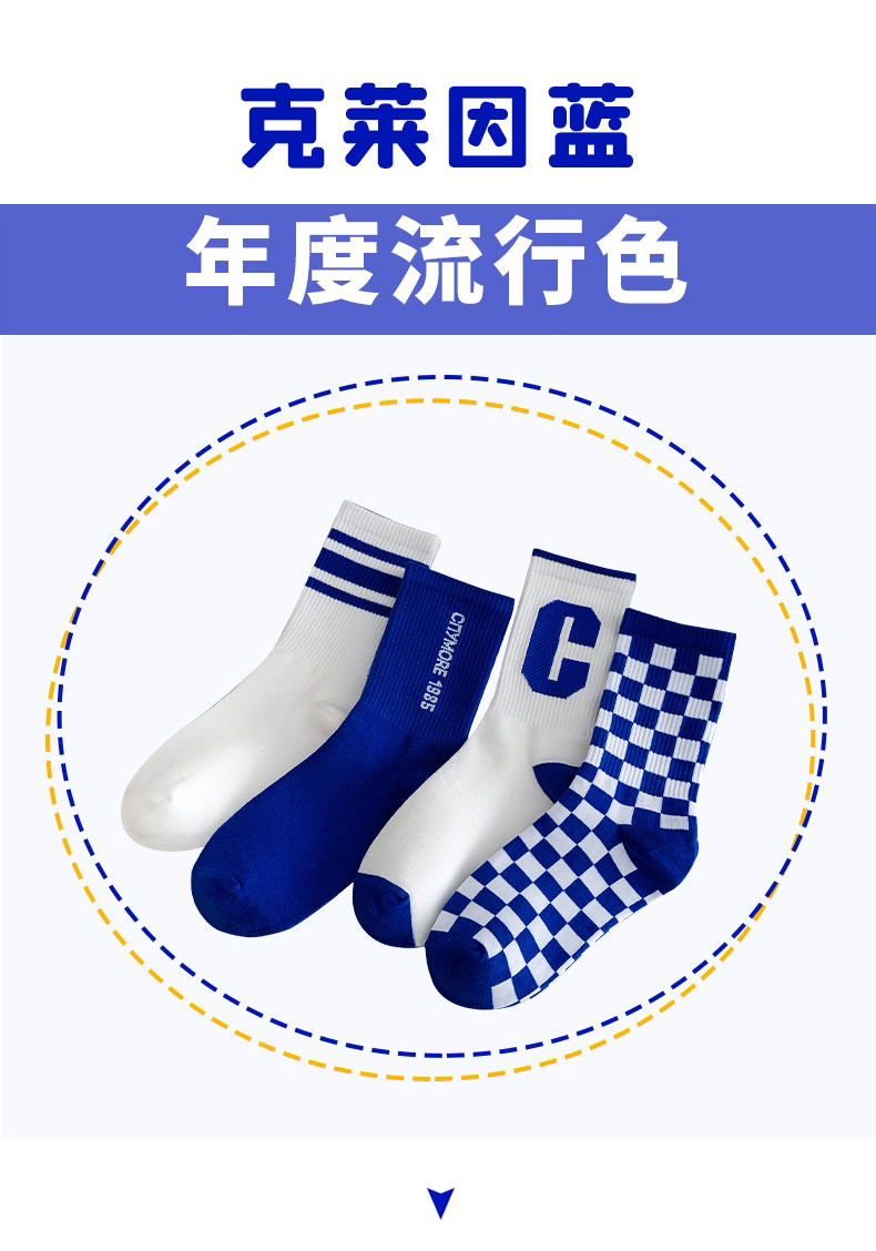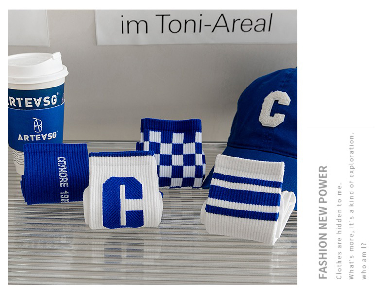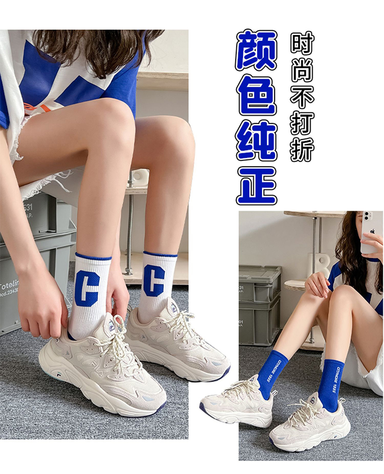 商品名称:【4双装】朝暮栖止女士印花潮流大C款蓝色系中筒棉袜子
