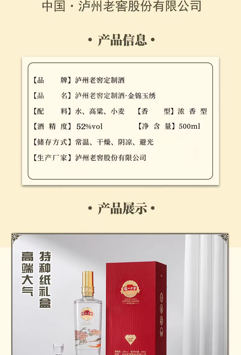 商品名称:泸州老窖金锦玉绣浓香型白酒500ML