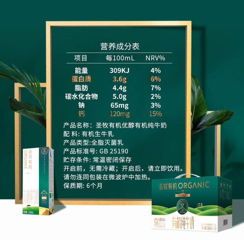 商品名称:圣牧全程有机奶纯牛奶优醇250ml*10包