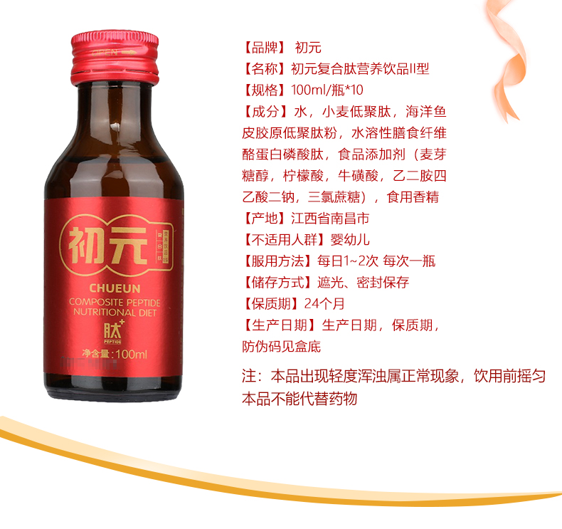 商品名称:江中初元 复合肽营养饮品礼盒装II型 100ml*10瓶 营养品补品送礼礼盒送长辈日常营养补充