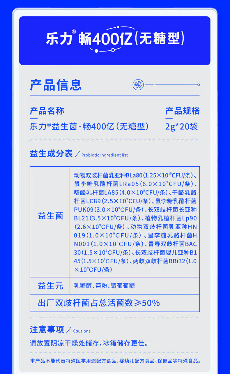 商品名称:乐力0糖型益生菌8000亿(畅)活菌2g*20条装成人女性儿童孕妇肠胃肠道益生元