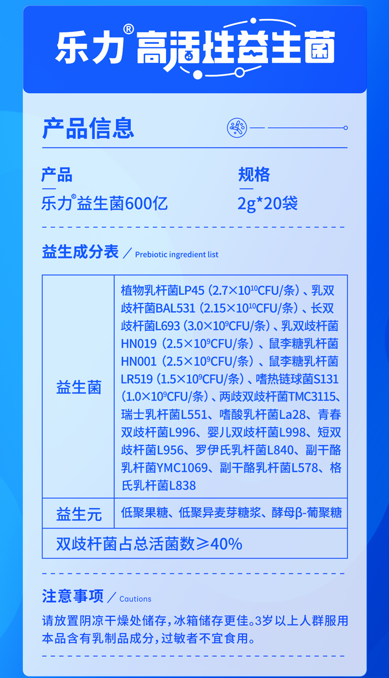商品名称:乐力益生菌(畅)1W2亿活菌2g*20条装成人女性儿童孕妇肠胃肠道益生元