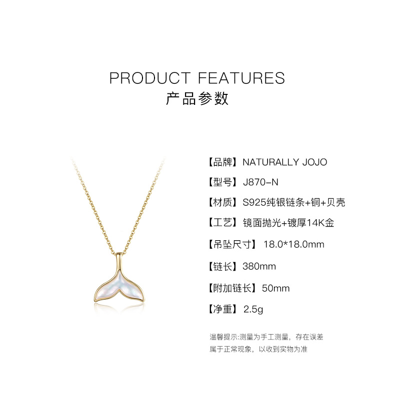 商品名称:NATURALLY JOJO女士纯银贝壳鱼尾项链女生轻奢小众高级设计感配饰锁骨链2023新款爆款饰品
