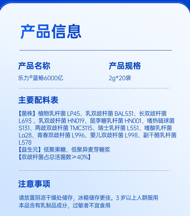 商品名称:乐力益生菌(畅)6000亿活菌加强版2g*20条装 成人男性女性儿童孕妇肠胃肠道益生元
