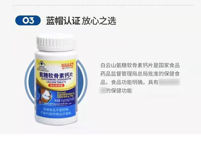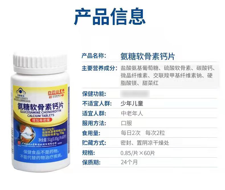 商品名称:【广药旗舰】白云山星群氨糖软骨素营养咀嚼钙片0.85g*60片成人中老年关节碳酸钙保健品
