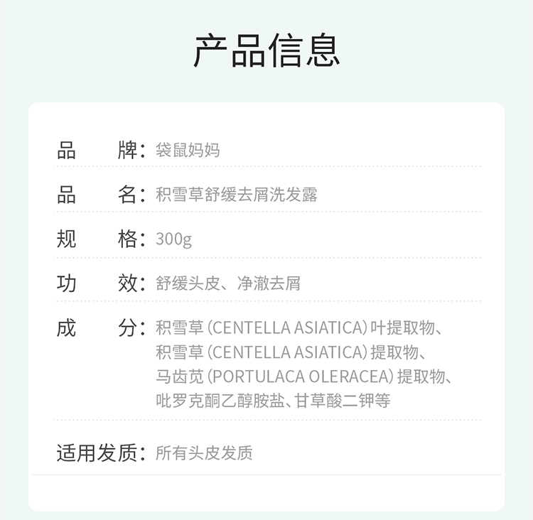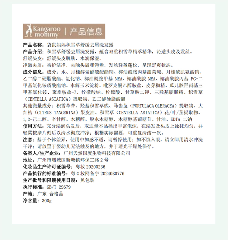 商品名称:袋鼠妈妈积雪草洗发水洗发露洗护去屑准孕妇洗护用品准孕妇洗发水品牌直供洗护300g