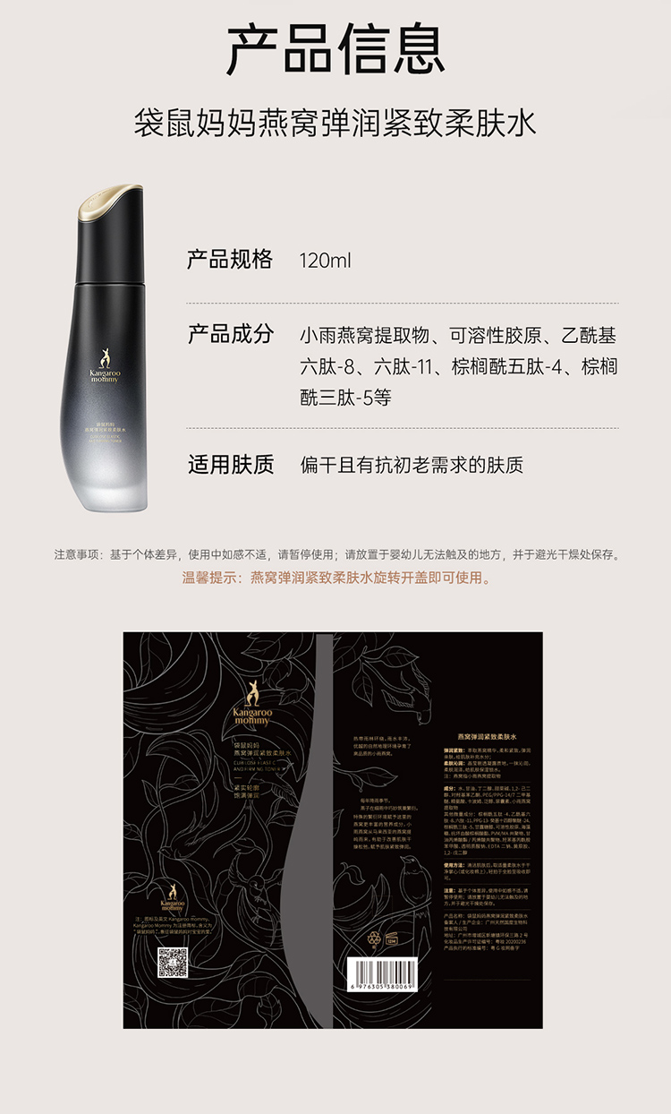 商品名称:【燕窝爽肤水】袋鼠妈妈燕窝弹润紧致准孕妇爽肤水清爽补水保湿干皮适用柔肤水120ml