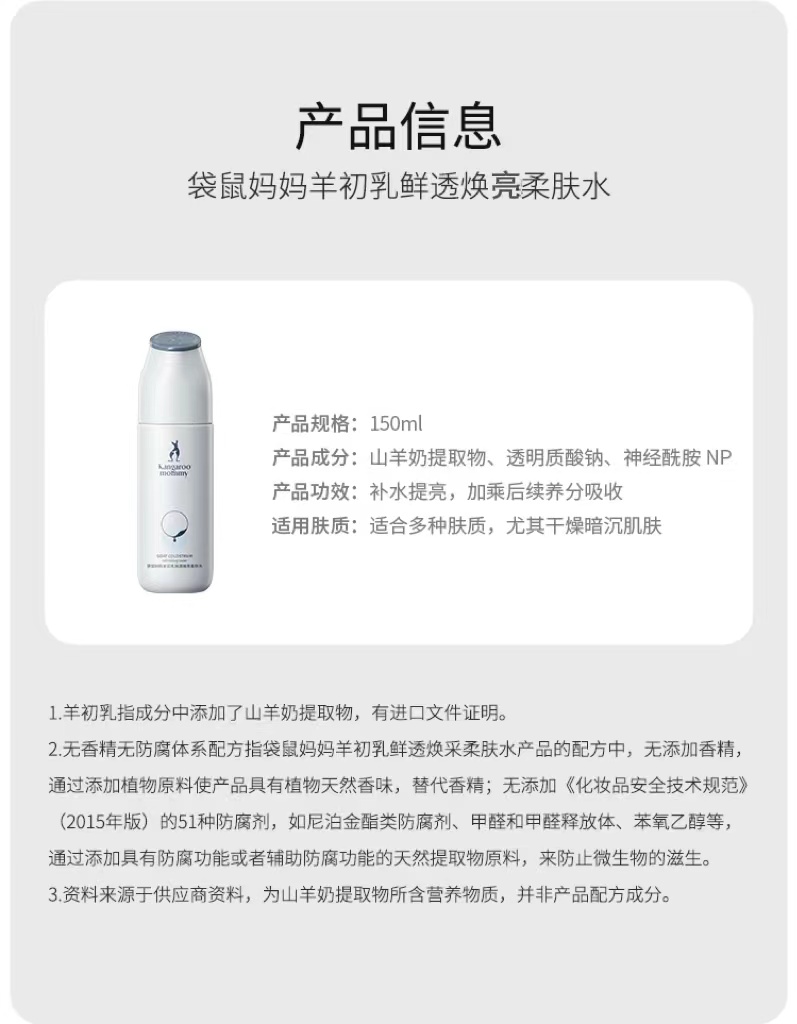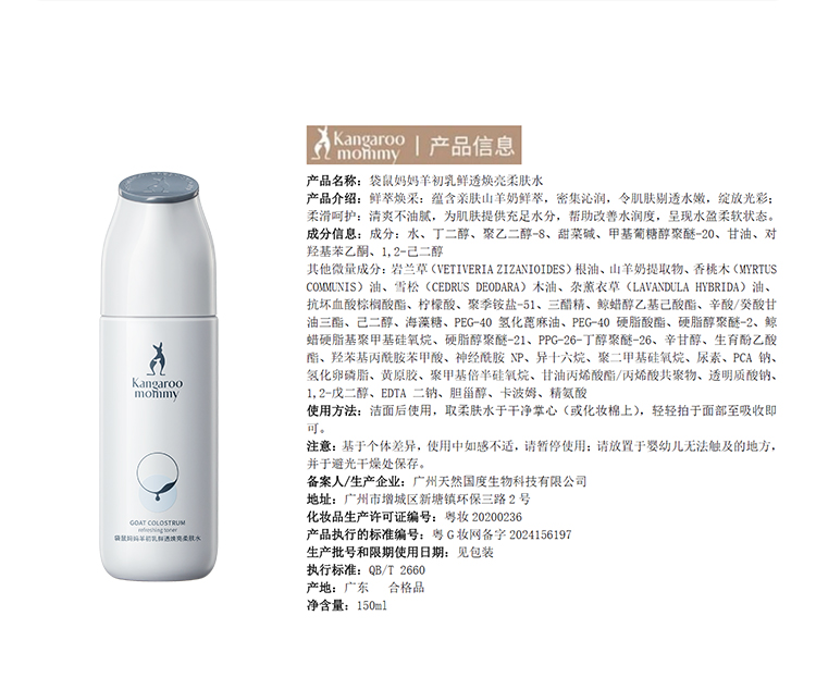 商品名称:袋鼠妈妈准孕妇护肤品羊初乳莹润冬季雪肌营养水准孕妇爽肤水补水保湿化妆水150ml