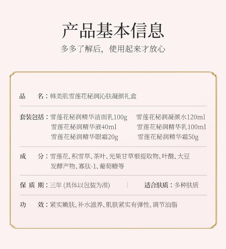 商品名称:韩美肌雪莲花秘润沁肤护肤品6件套装补水化妆品补水保湿清洁美容养颜