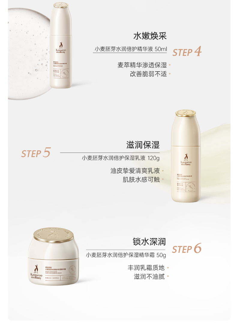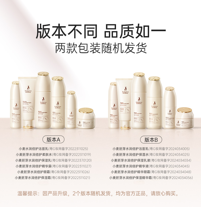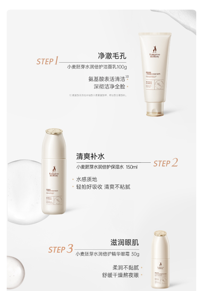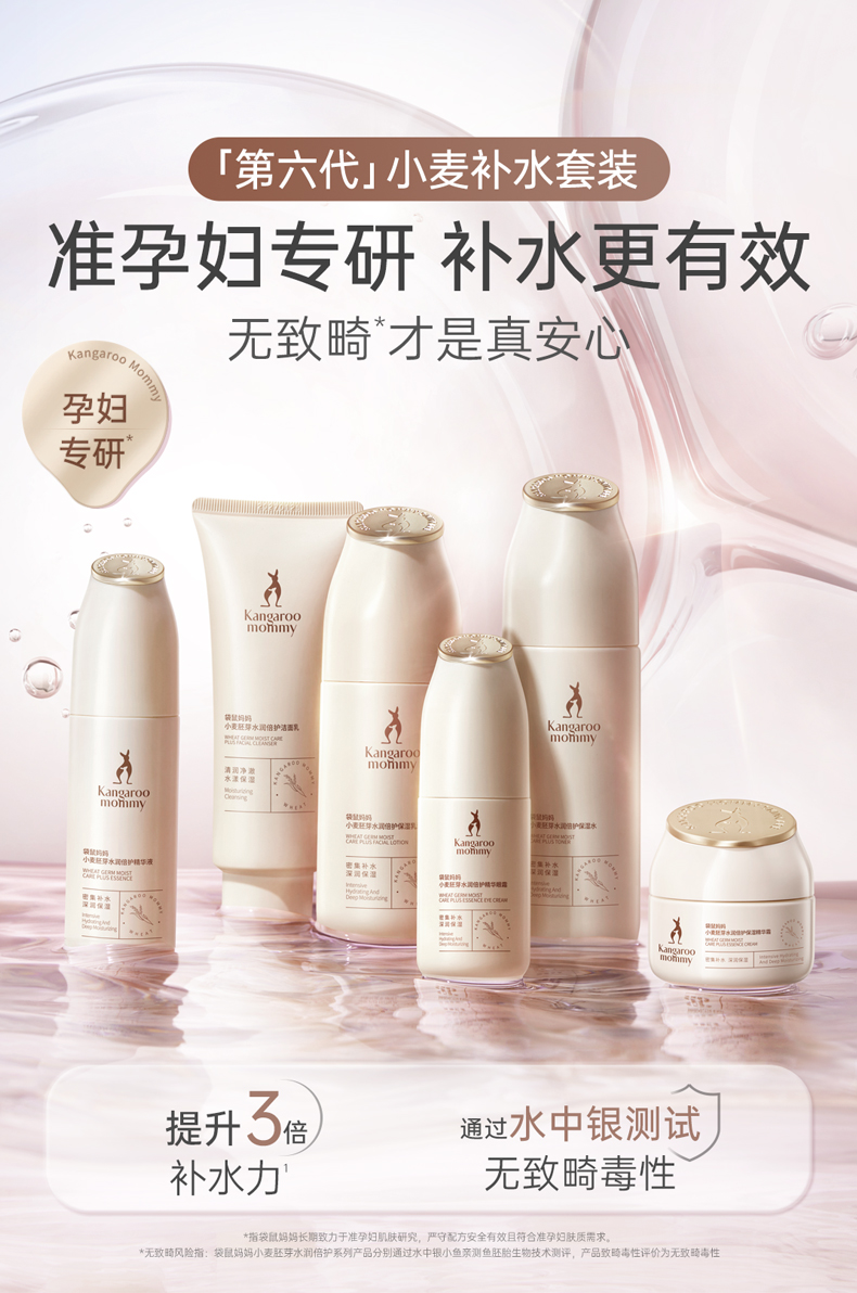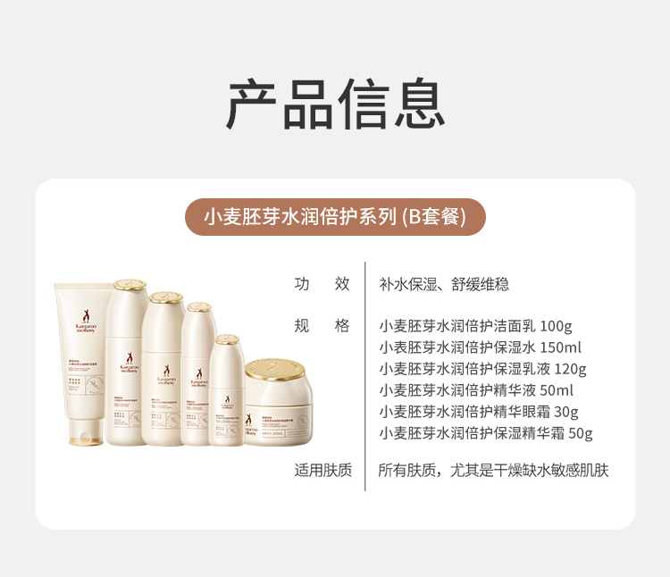 商品名称:【秋冬滋润补水】袋鼠妈妈洗面奶水乳面霜6件套孕妇可用小麦护肤品套装保湿单支发货