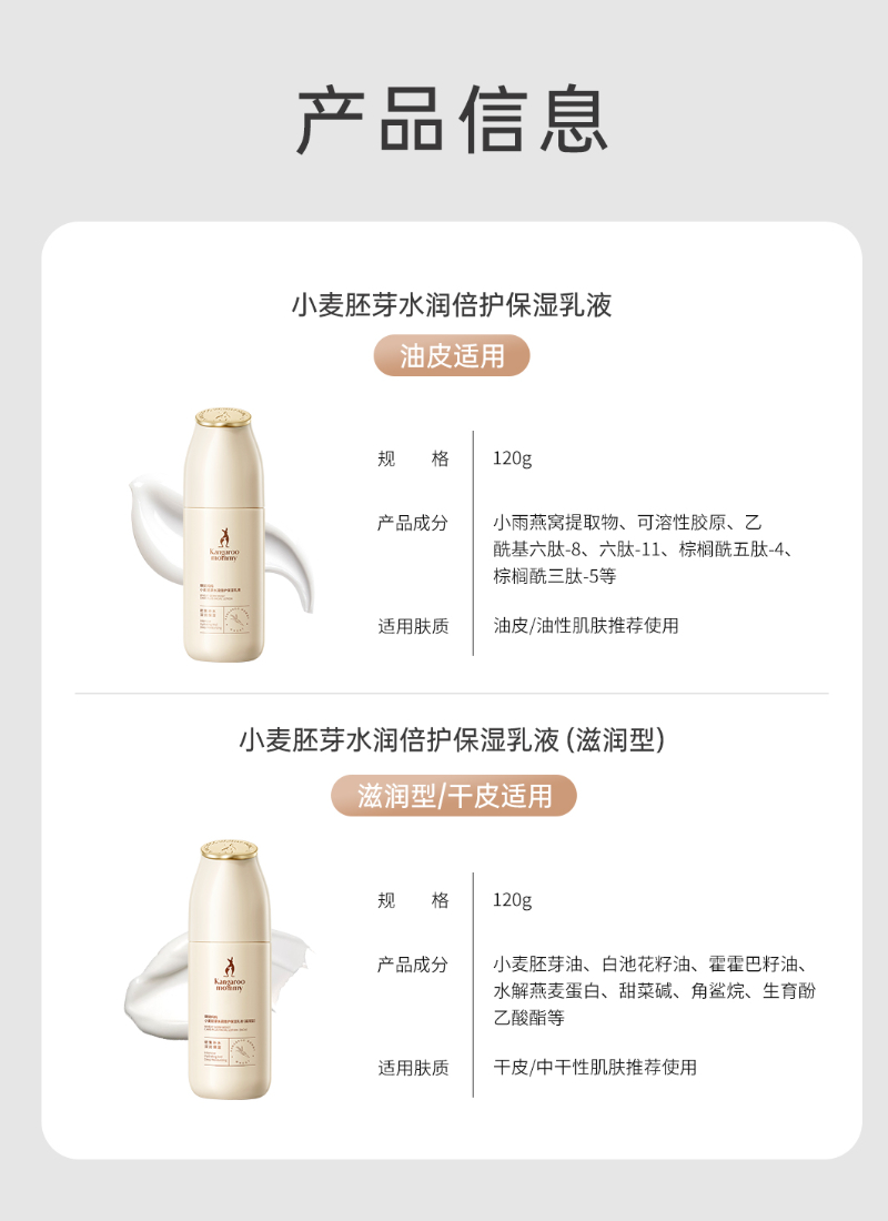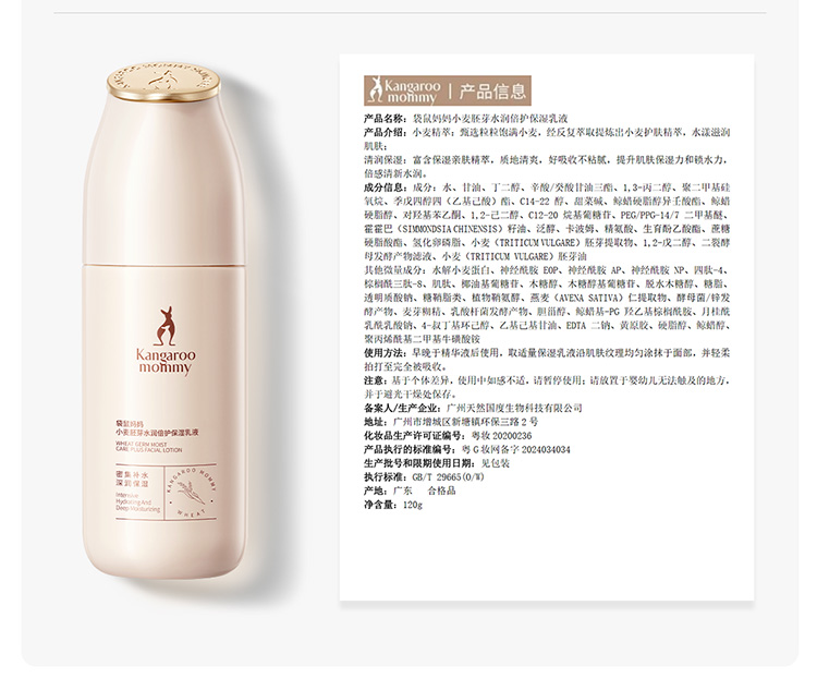 商品名称:袋鼠妈妈小麦保湿乳液准孕妇可用补水保湿乳润肤乳学生清爽乳液擦脸护肤品正品120g