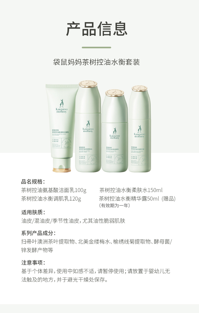 商品名称:袋鼠妈妈准孕妇护肤品茶树控油套装洁面乳水乳补水保湿油皮专用化妆品送精华单支发货