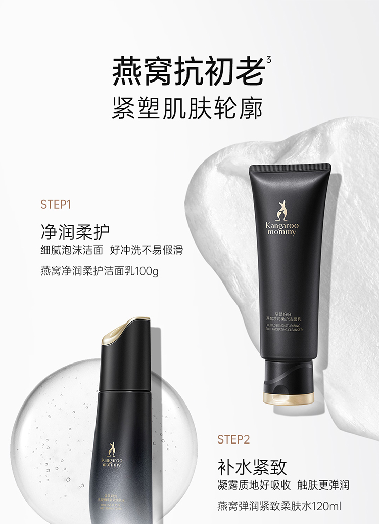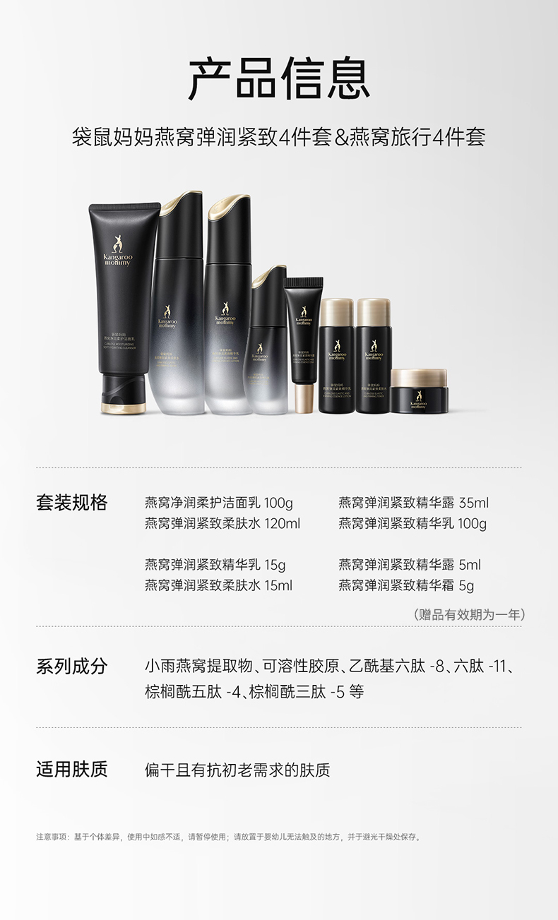 商品名称:袋鼠妈妈燕窝护肤品套装4件套准孕妇补水保湿洁面面霜爽肤水滋润单支发货送旅行装