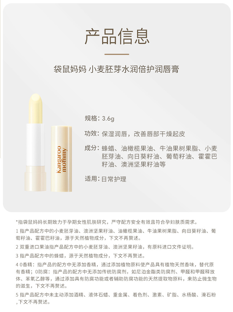 商品名称:唇膏袋鼠妈妈润唇膏女保湿滋润补水准孕妇可用植物护唇膏护肤品专用官方旗舰店3.6g