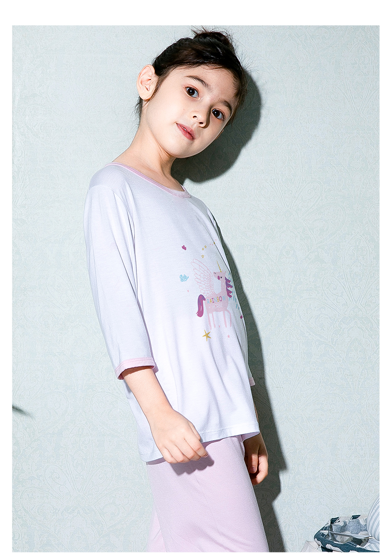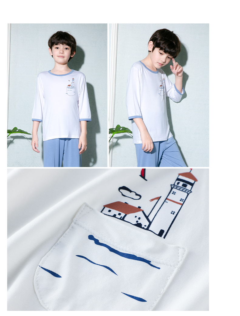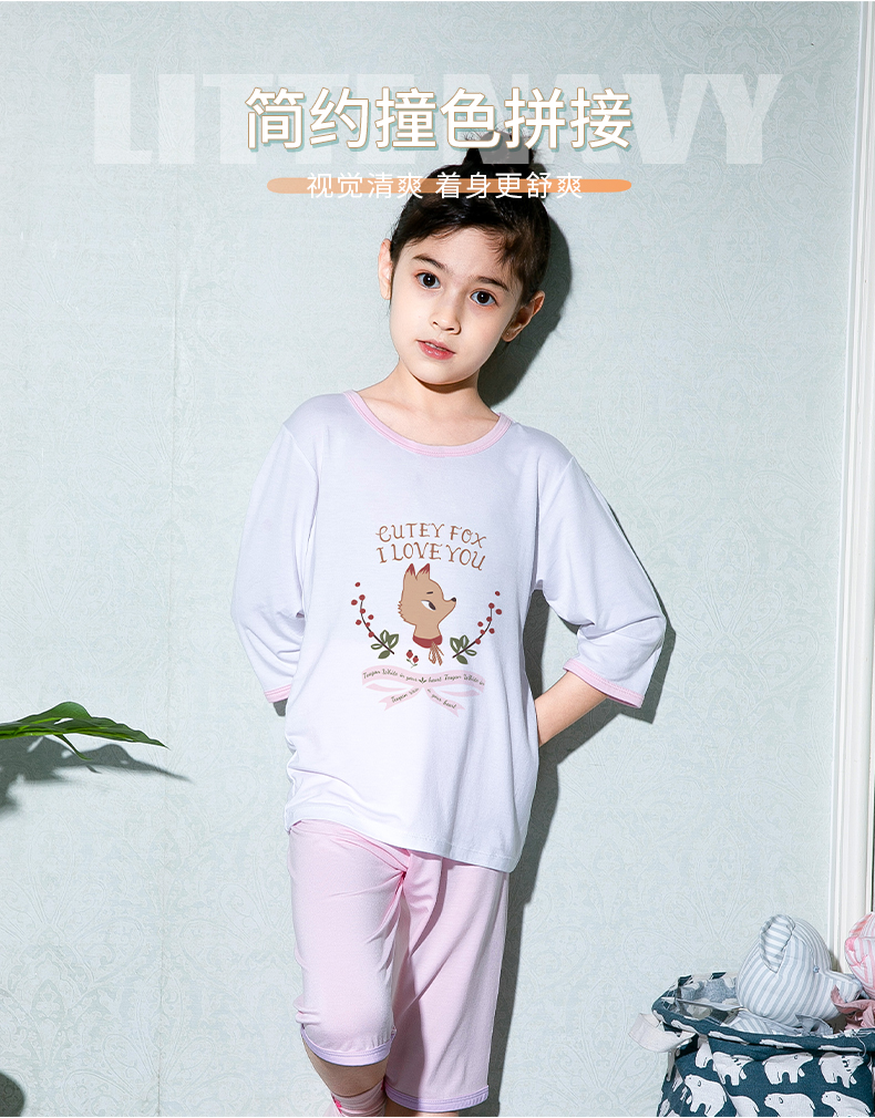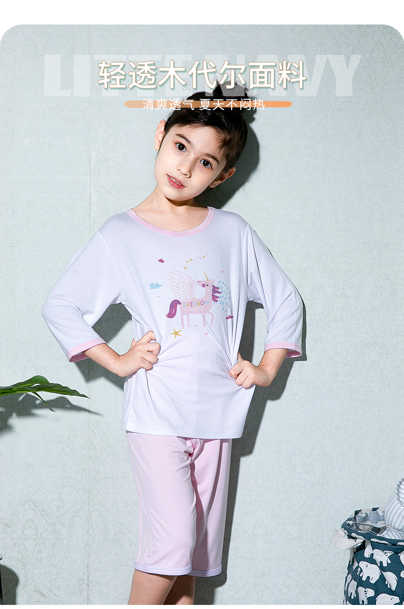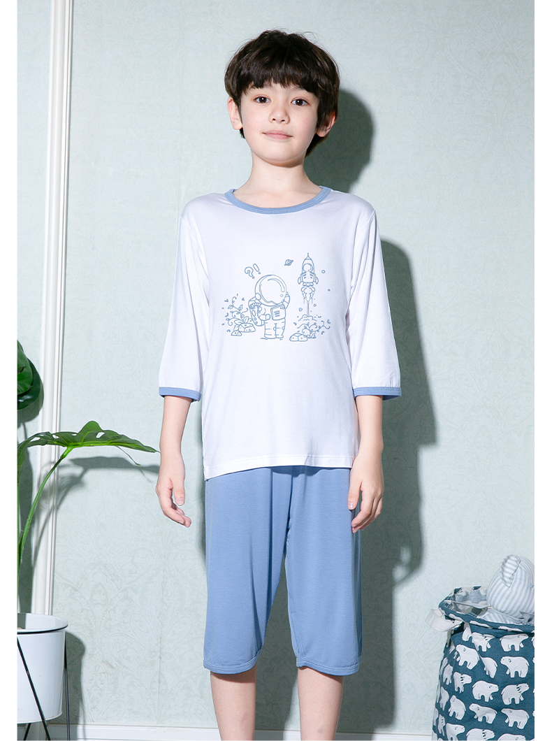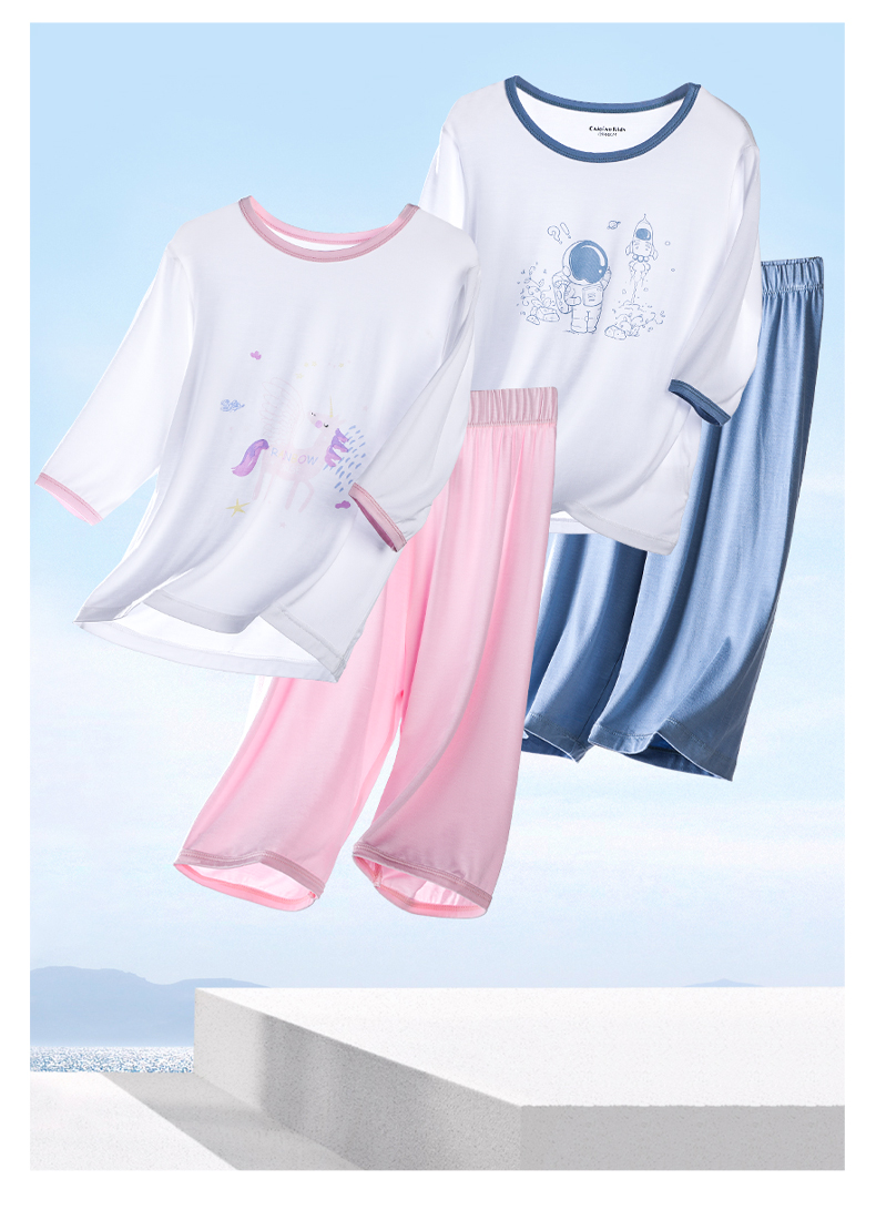 彩桥儿童莫代尔睡衣夏季薄款男童七分袖亲子家居服套装冰丝女童空调服