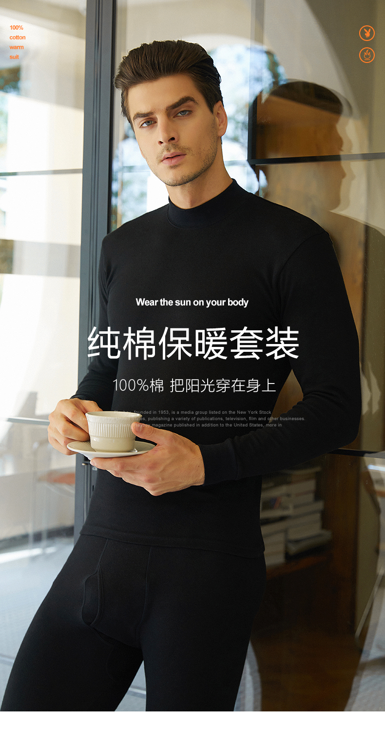 【品牌特供】花花公子保暖内衣男士纯棉青少年秋衣秋裤套装中高领全棉毛衫打底长裤子