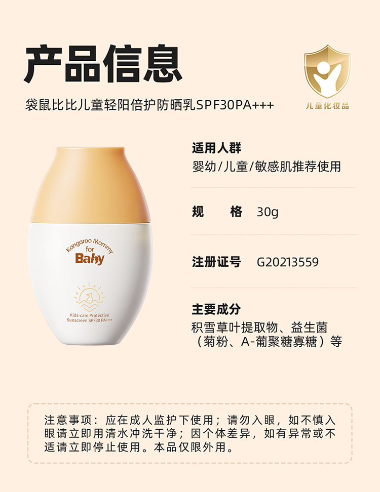 商品名称:【宝宝防晒霜】袋鼠比比儿童宝宝防晒夏季隔离霜婴幼儿物理防晒防紫外线SPF30防晒乳30g
