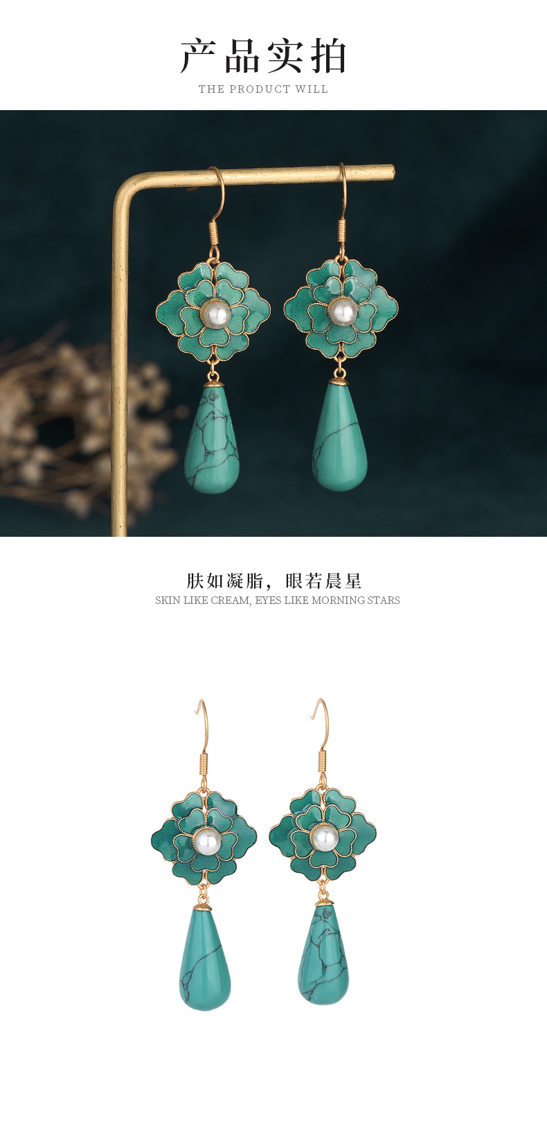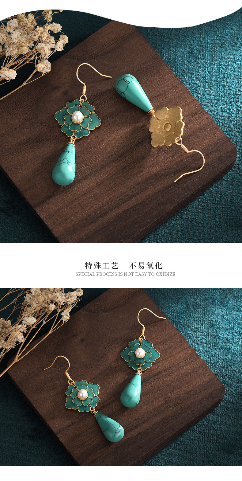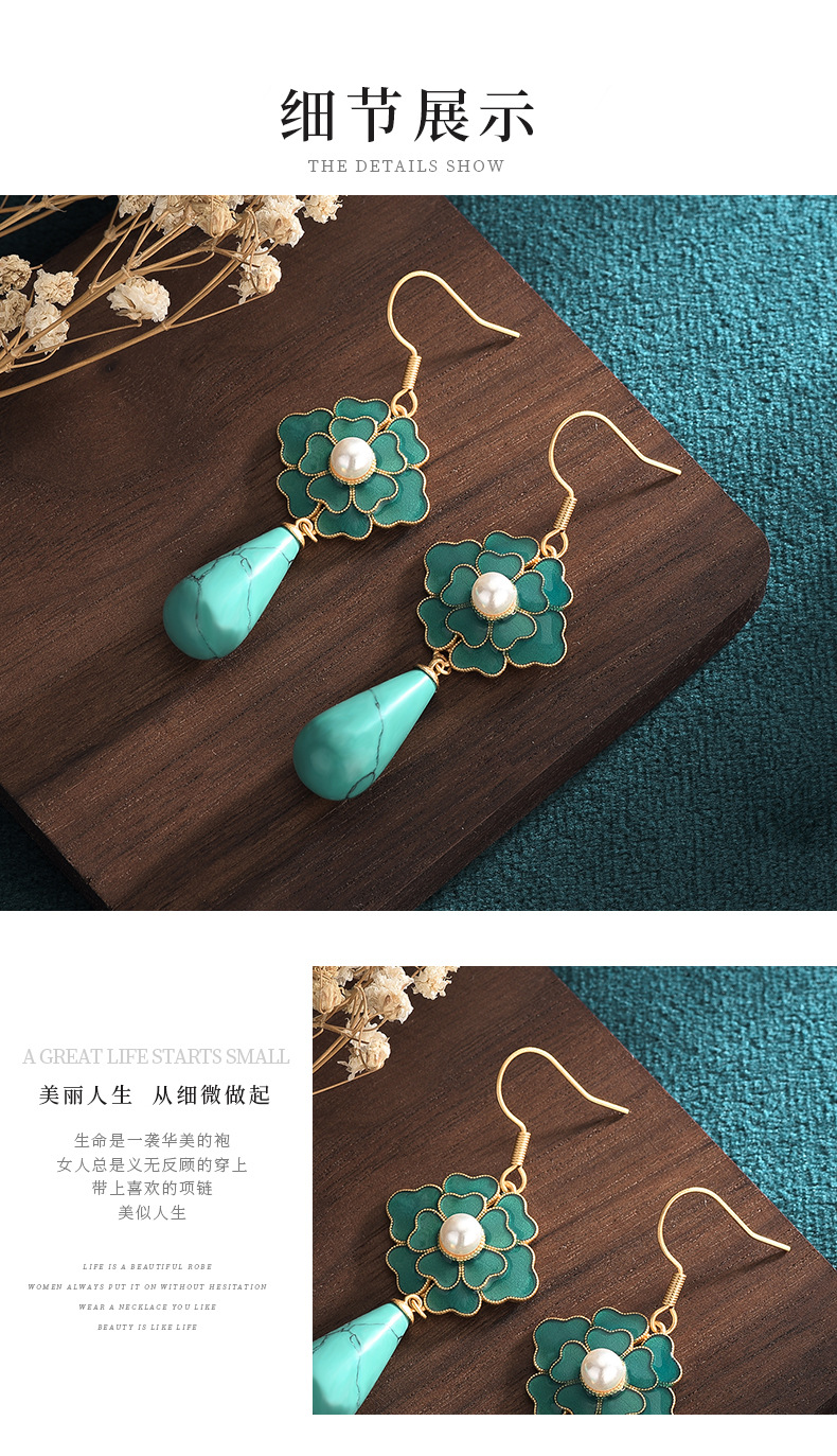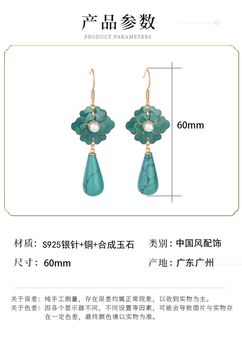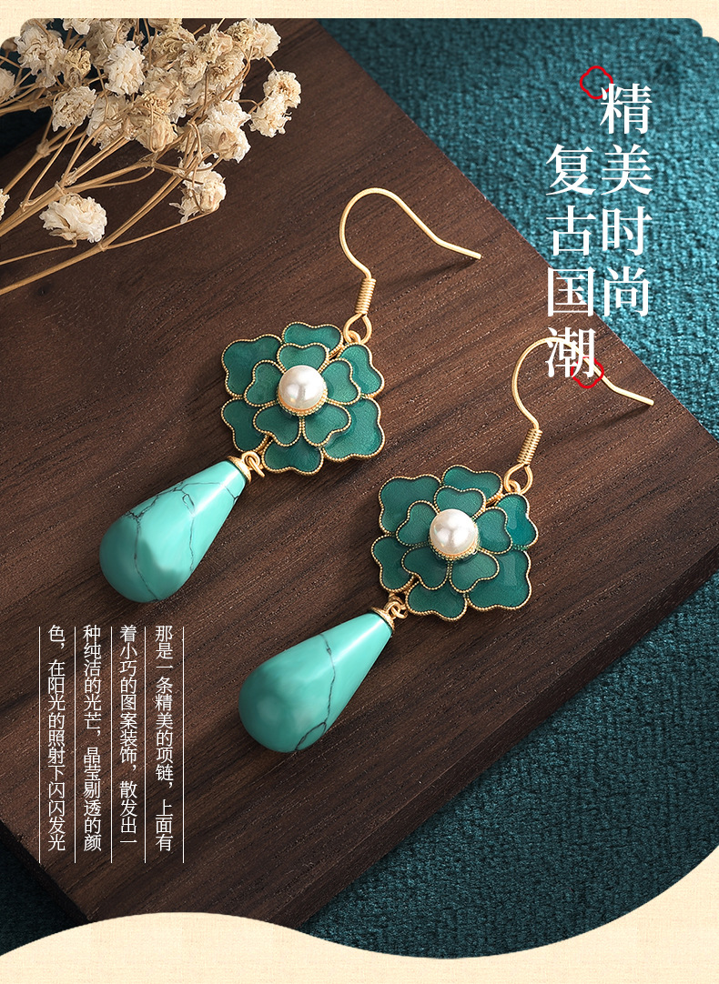 商品名称:彤彤兔 国潮新品中国元素设计配饰古法珐琅山茶花复古仿松石合成玉石耳环