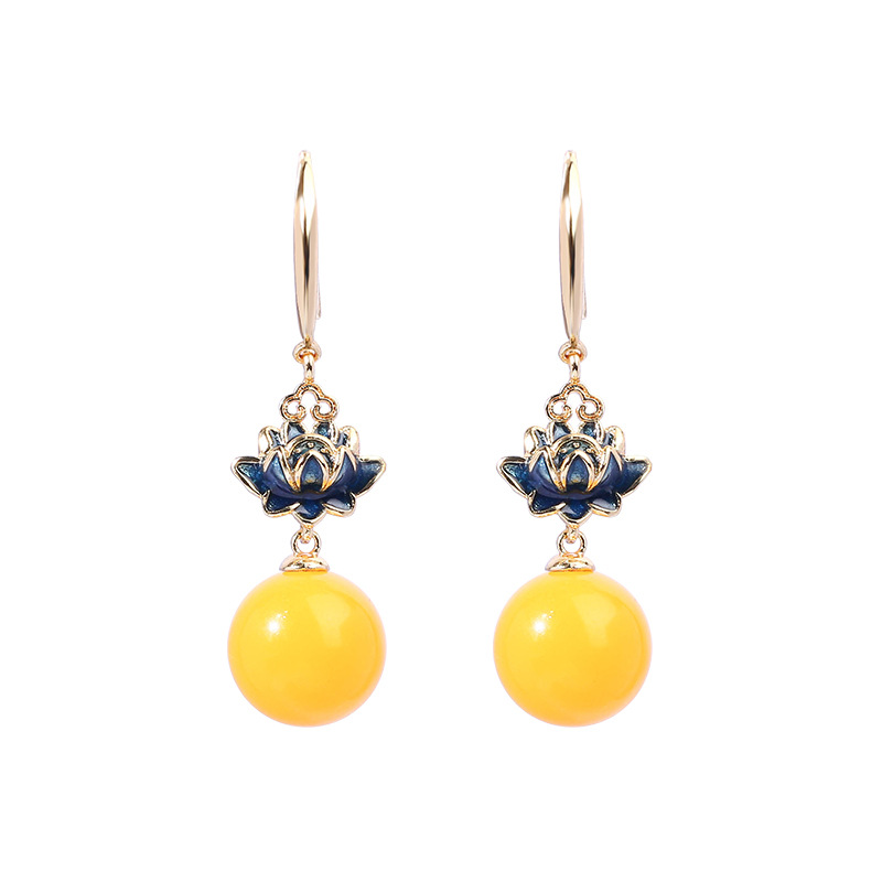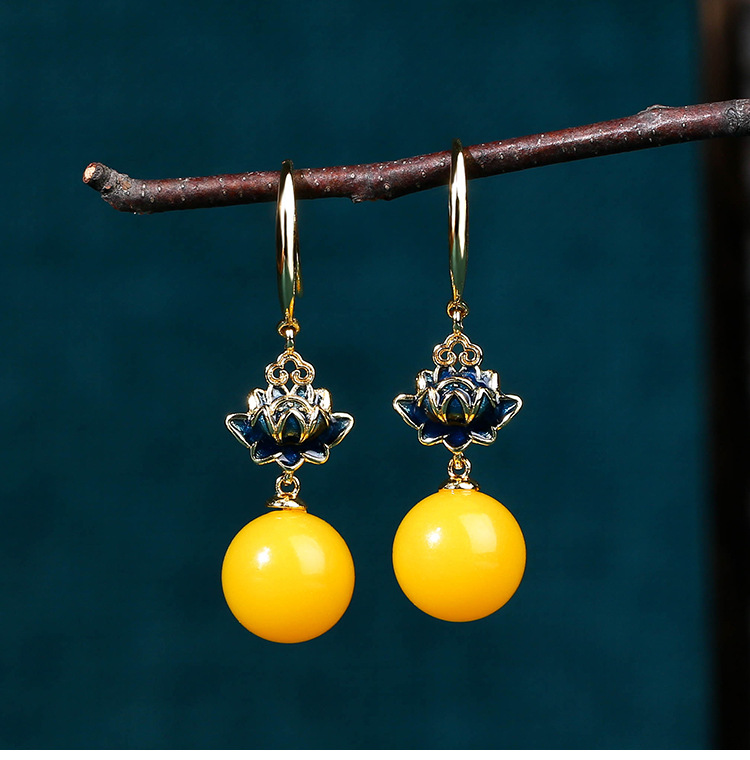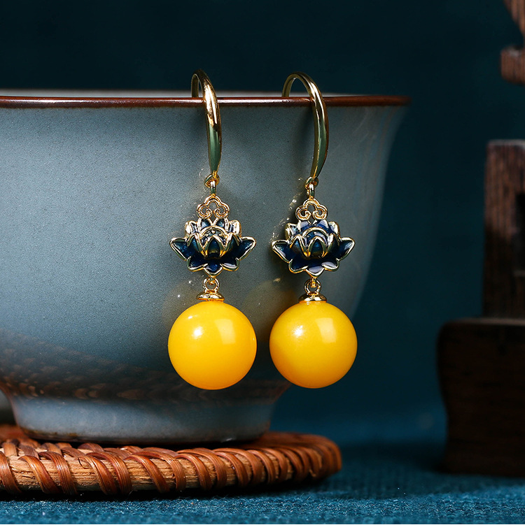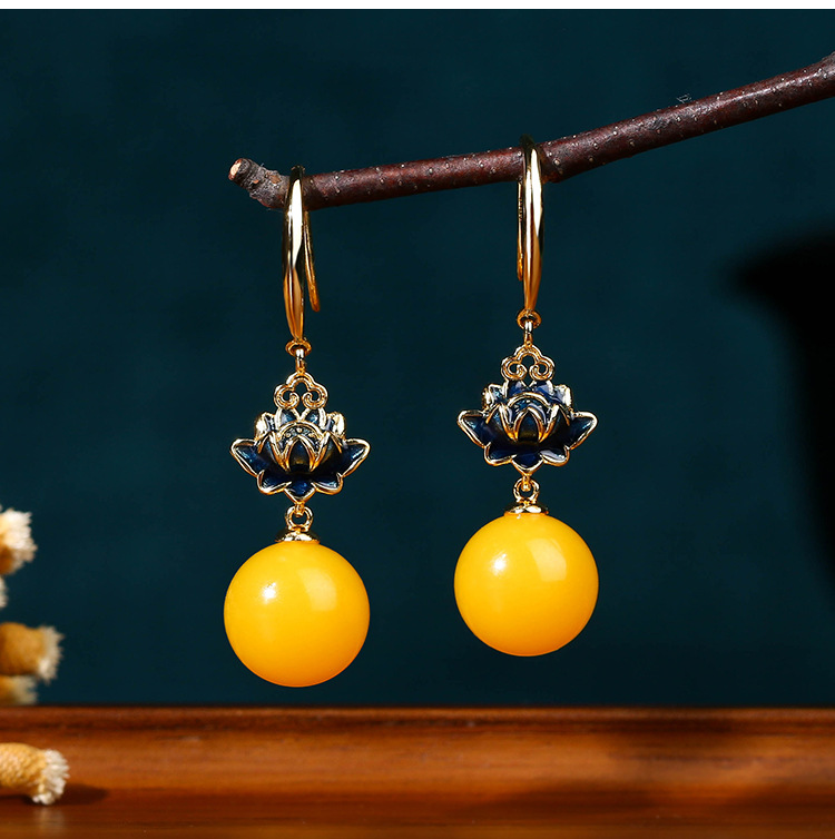 彤彤兔 小众设计仿蜜蜡琥珀合成玉石耳环女国潮宫廷风烧蓝莲花马面裙配饰