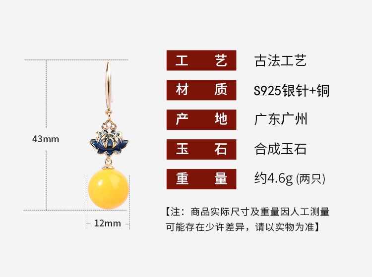 商品名称:彤彤兔 小众设计仿蜜蜡琥珀合成玉石耳环女国潮宫廷风烧蓝莲花马面裙配饰