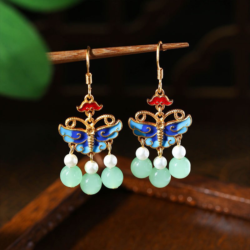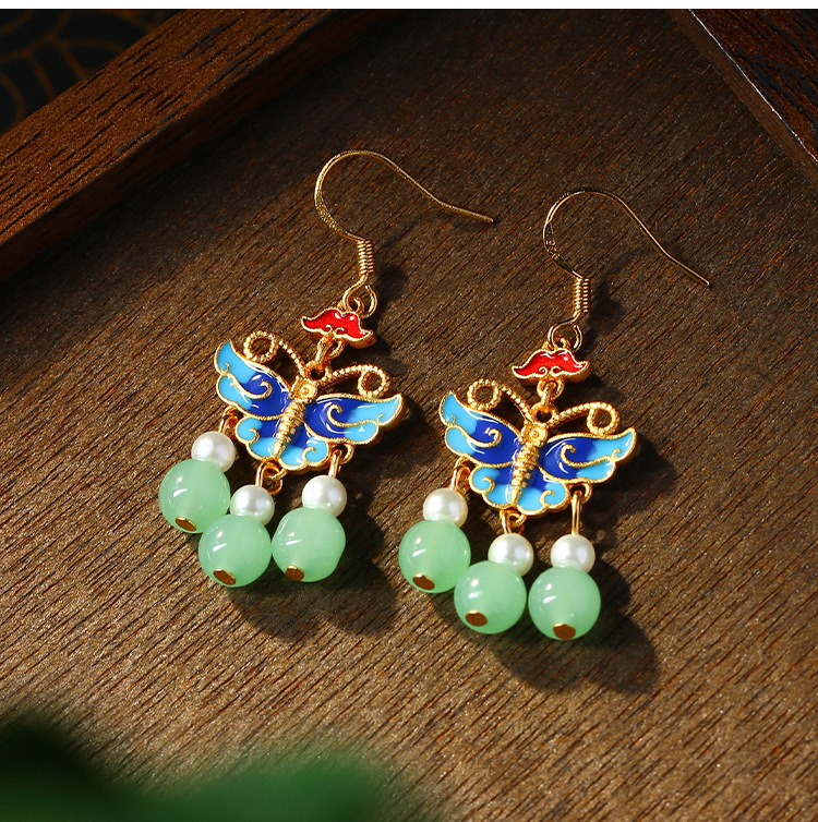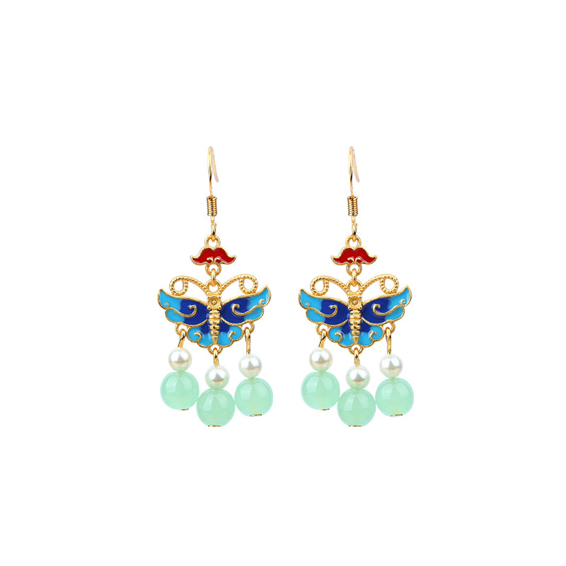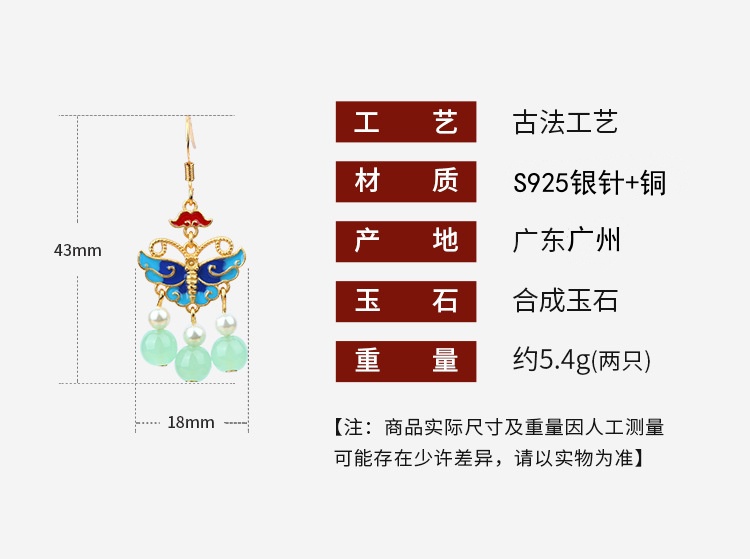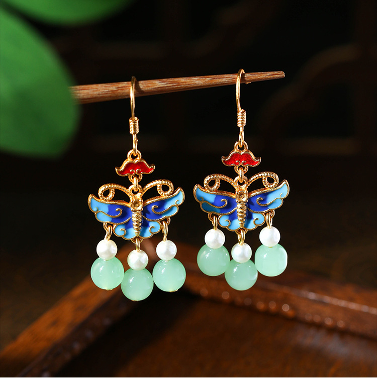商品名称:彤彤兔 新中式小众设计感古风景泰蓝烧蓝蝴蝶合成玉石耳环马面裙配饰