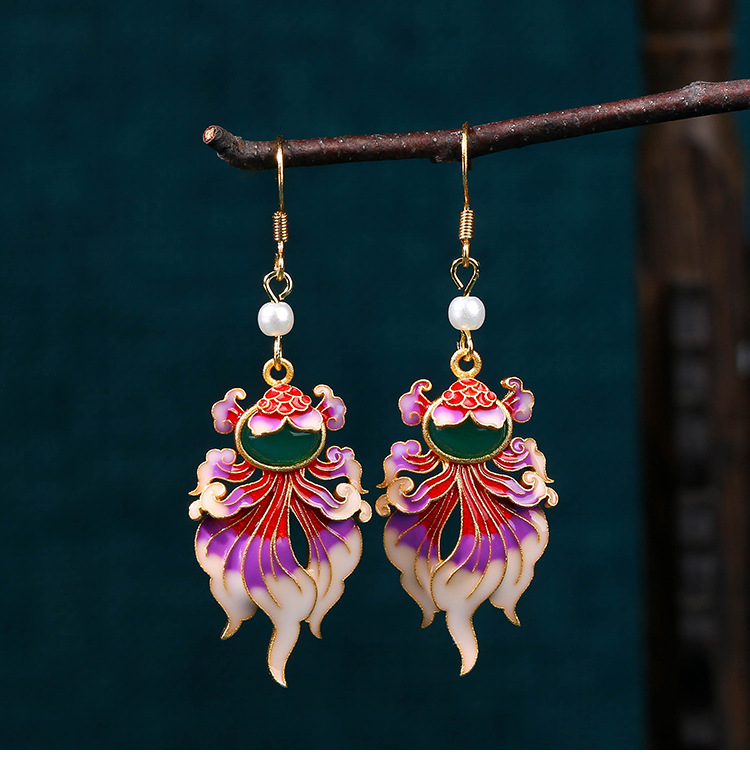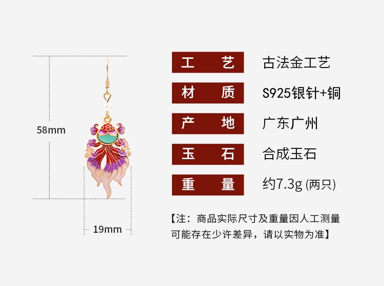 商品名称:彤彤兔 925银针珐琅年年有余锦鲤合成玉石复古耳环喜庆耳饰