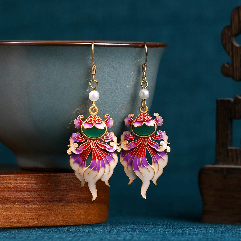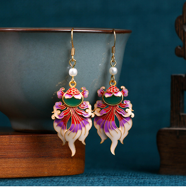 彤彤兔 925银针珐琅年年有余锦鲤合成玉石复古耳环喜庆耳饰