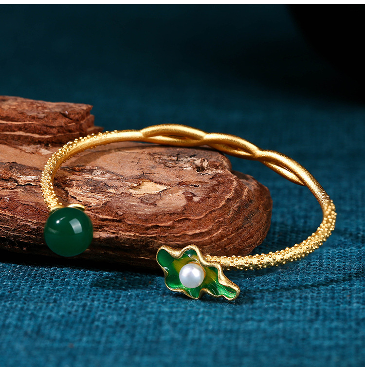 彤彤兔 民族宫廷风手饰古法饰品烧蓝合成玉石荷叶手镯手环
