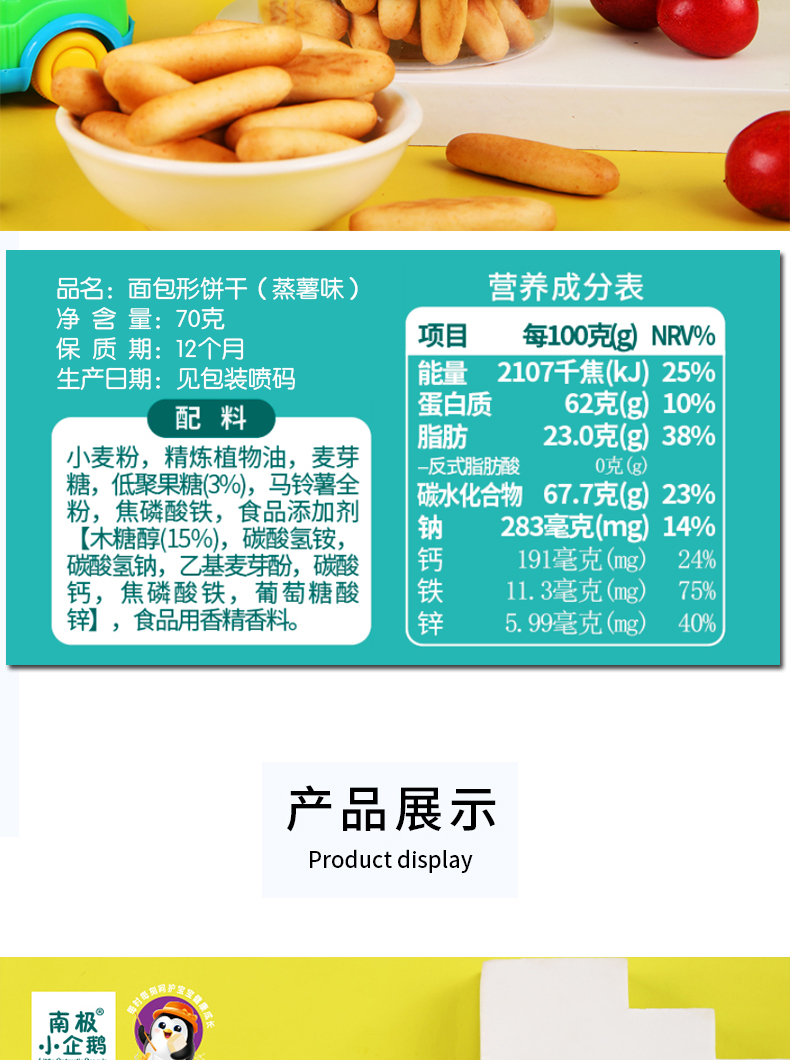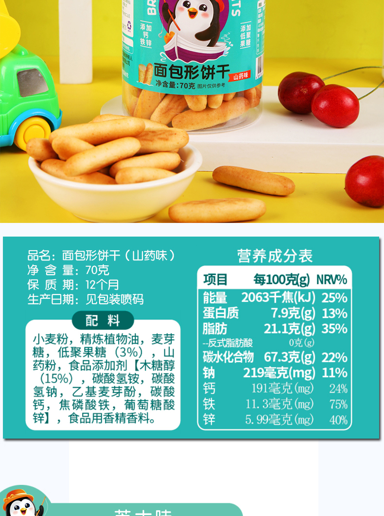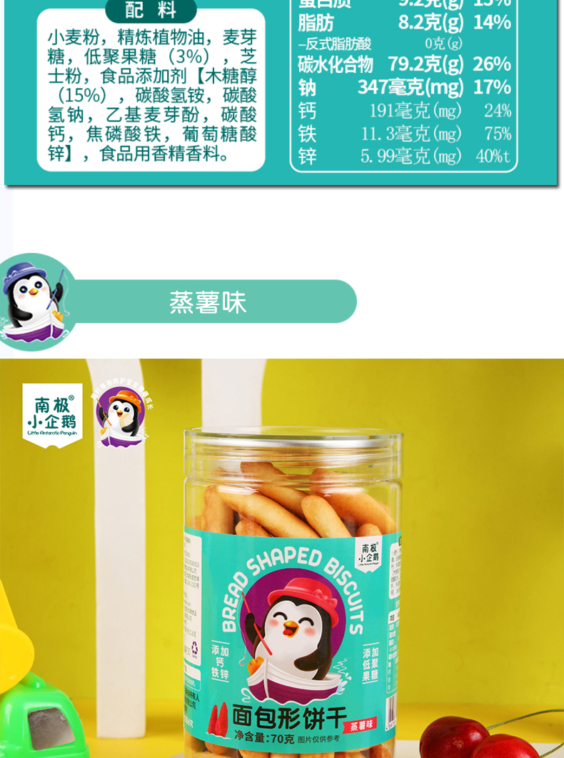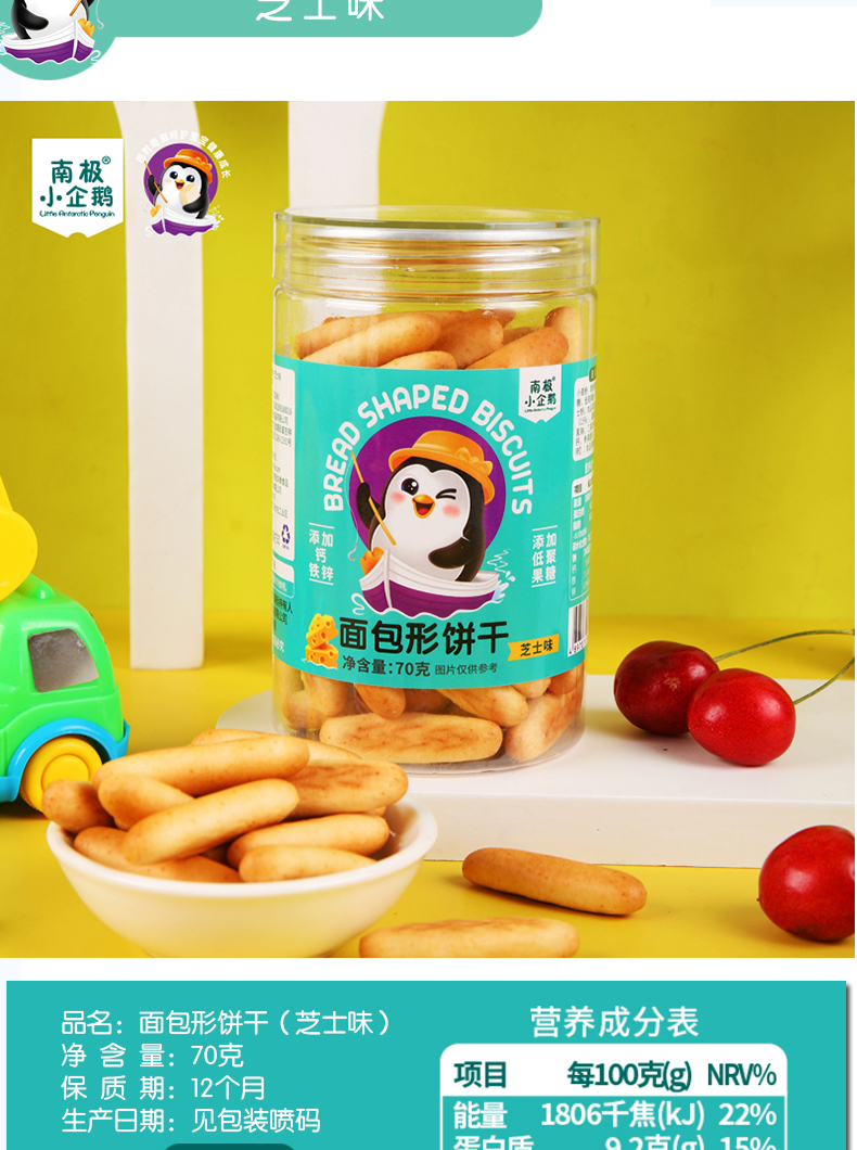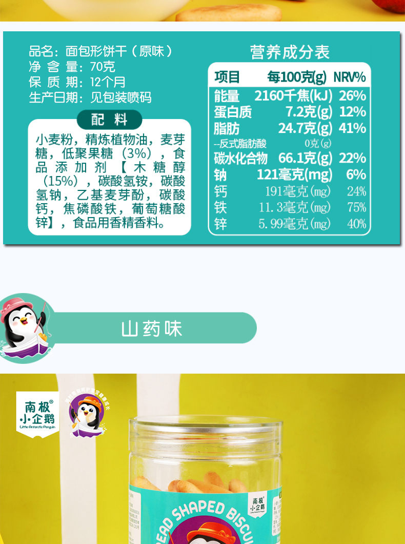 商品名称:南极小企鹅 木糖醇面包饼干70罐装4口味可选芝士牛奶蒸薯山药味 儿童辅食小零食