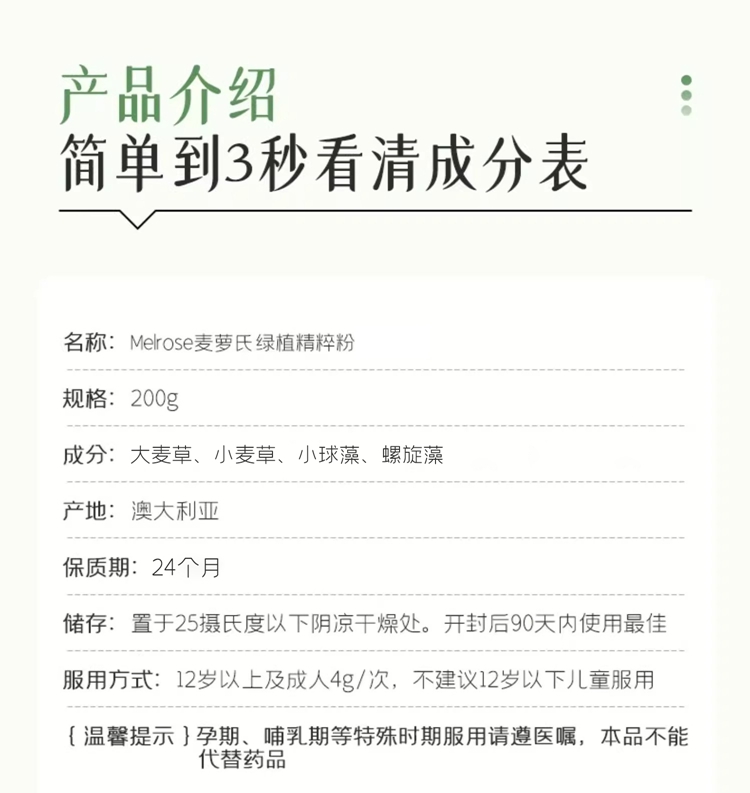 商品名称:麦萝氏melrose膳食纤维粉大麦若叶青汁澳洲绿瘦子200g