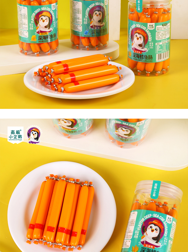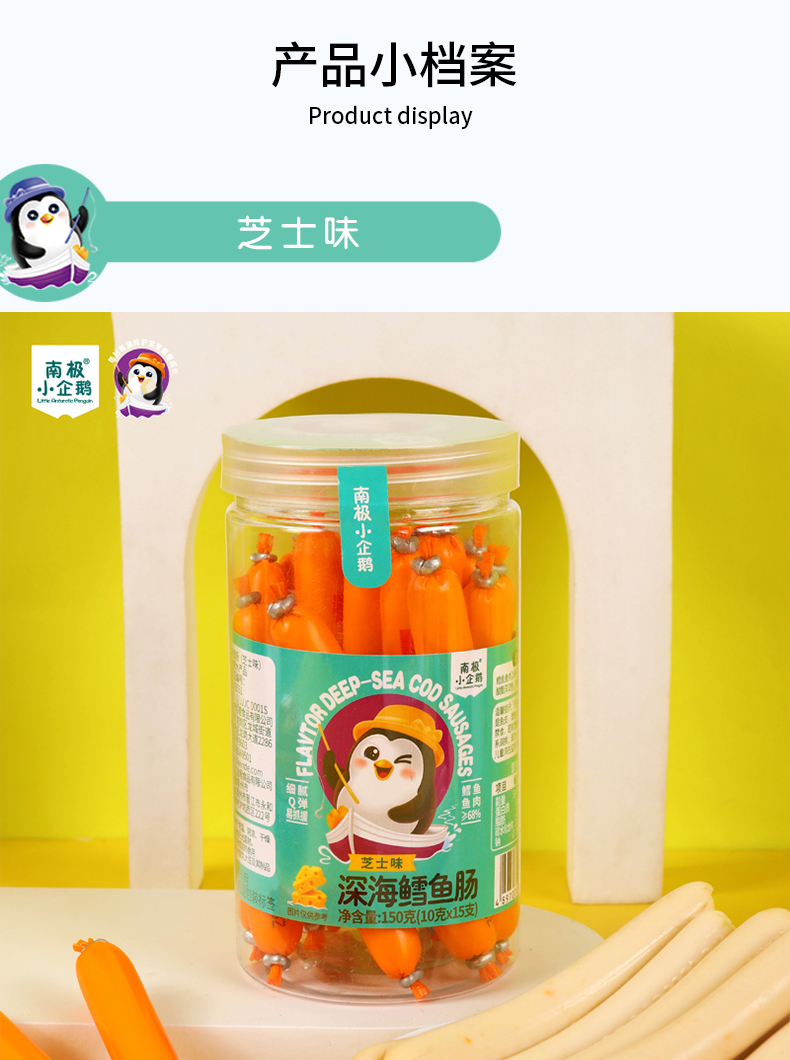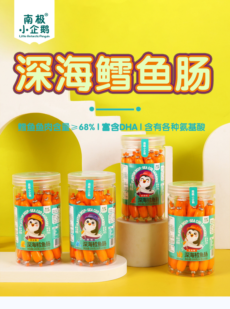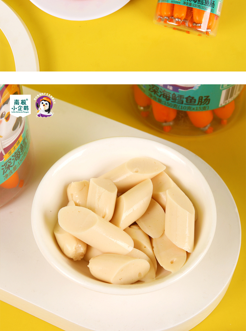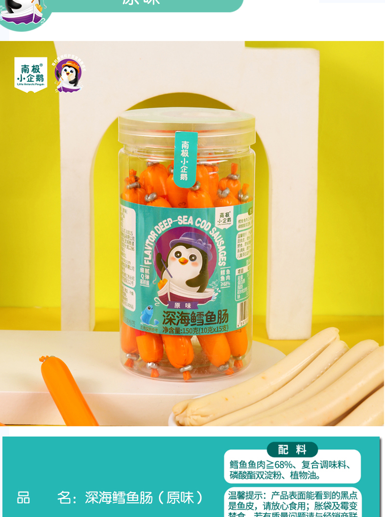 商品名称:月新货南极小企鹅深海鳕鱼肠 鳕鱼棒 150g 罐装10g*15根 四口味可选 火腿肠零食鱼肠