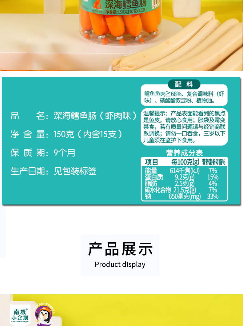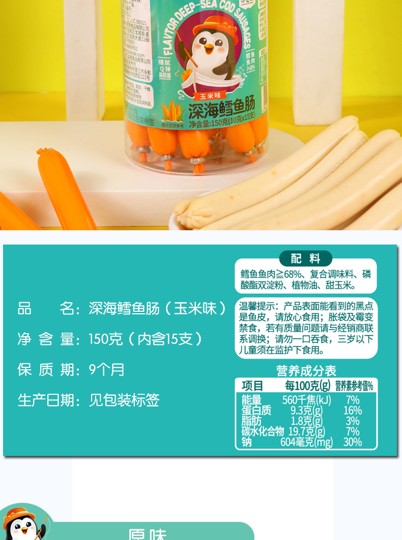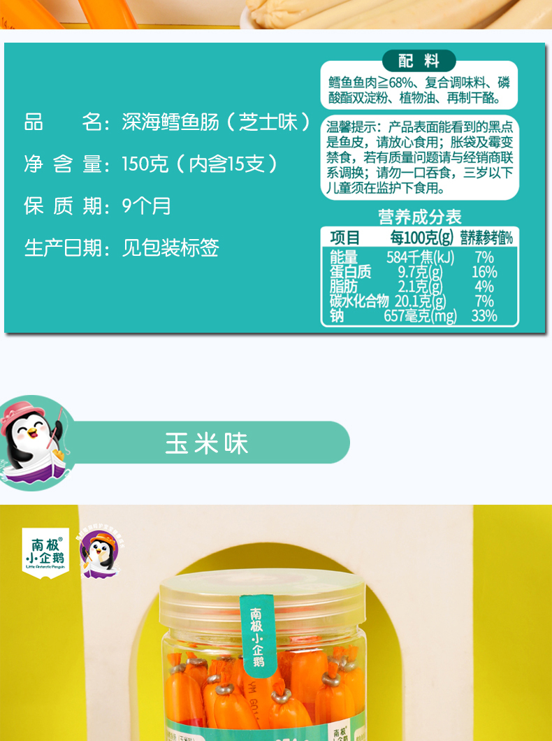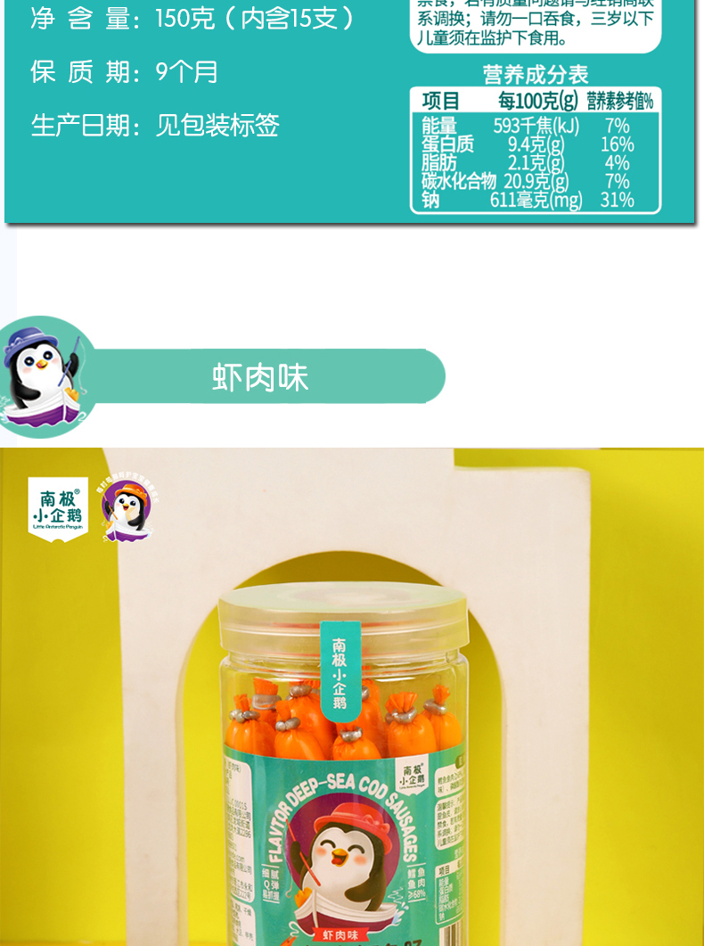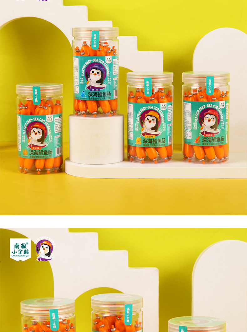 商品名称:月新货南极小企鹅深海鳕鱼肠 鳕鱼棒 150g 罐装10g*15根 四口味可选 火腿肠零食鱼肠