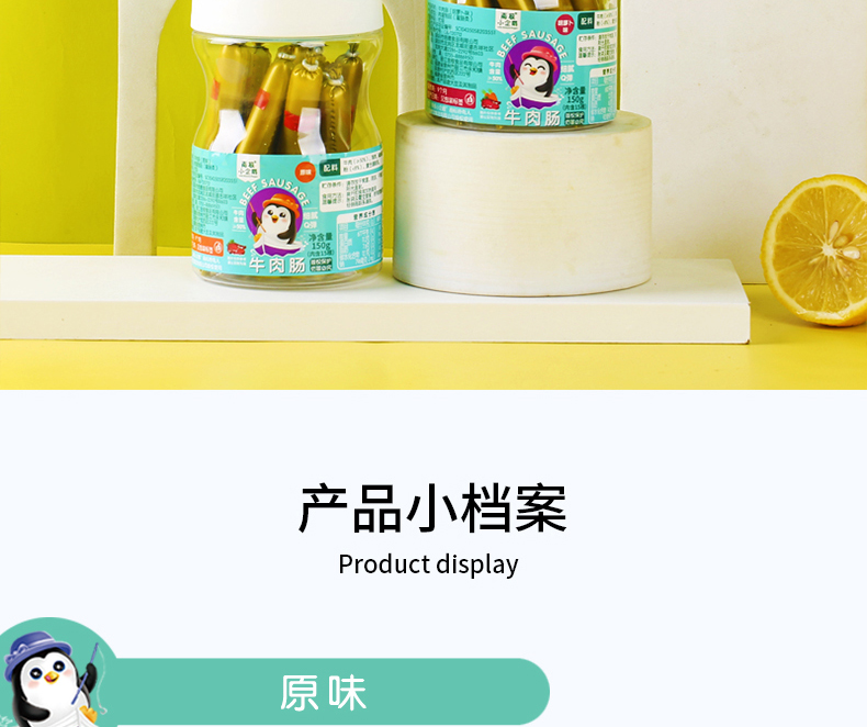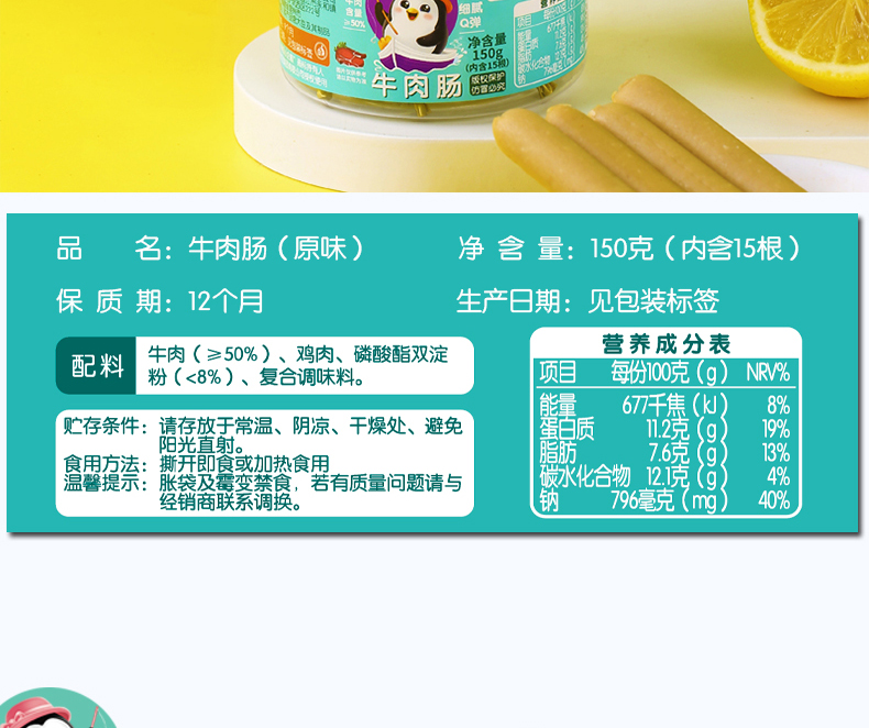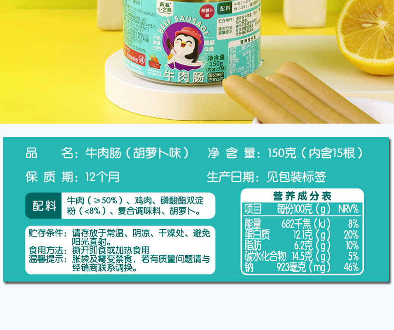 商品名称:南极小企鹅品牌 牛肉肠 原味胡萝卜口味可选 150g(10g*15根)儿童零食营养美味牛肉棒